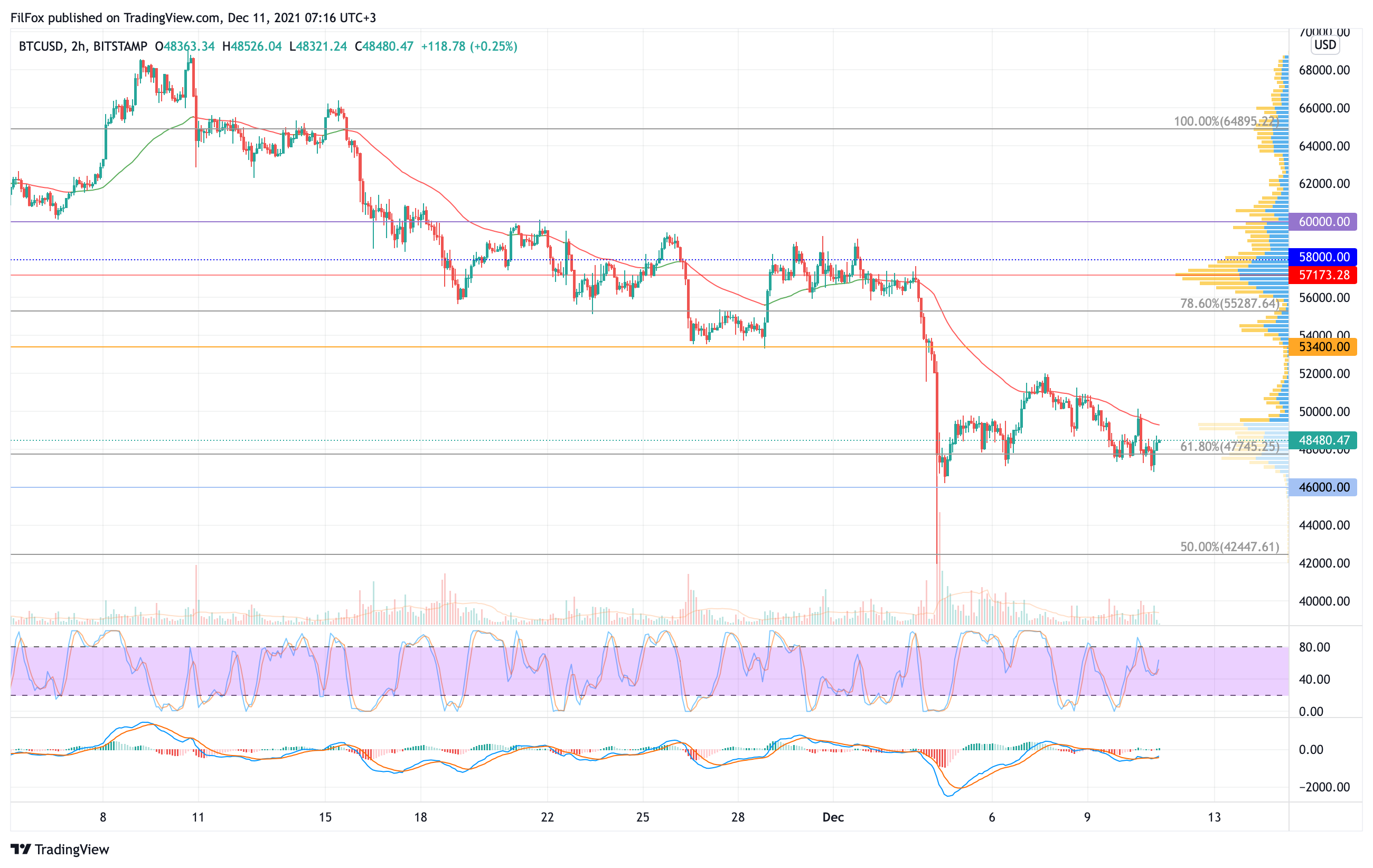 Вчера утром казалось, что уровень 61.8% фибо (47745.25 USD) выдержит медвежий натиск, и пара BTC/USD сможет восстановиться выше средних цен. Однако, двухчасовая скользящая средняя EMA55 ограничила восстановление пары в районе отметки 50000.00 USD и отбросила Bitcoin к поддержке на уровне 61.8% фибоначчи.