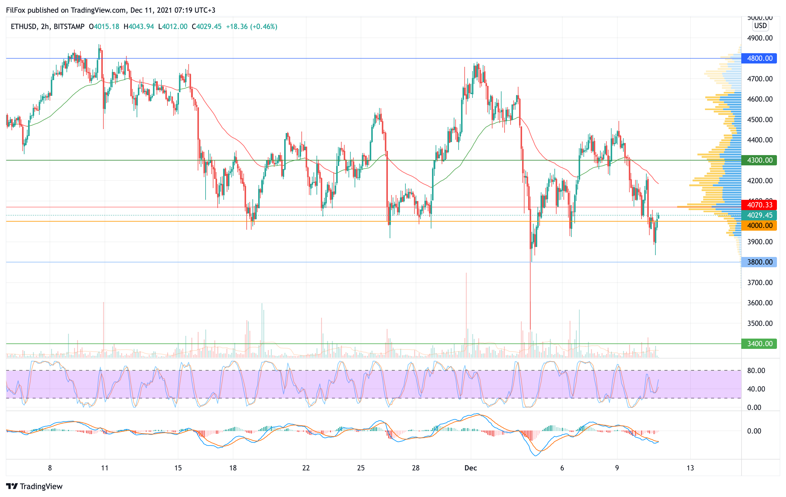 На сегодняшнее утро цена отскочила выше четырёх тысяч, но объёмы покупок низкие. Если покупатели не смогут нарастить объёмы, то закрепиться выше уровня средних цен не получится и цена откатится к поддержке 3800.00 USD.
