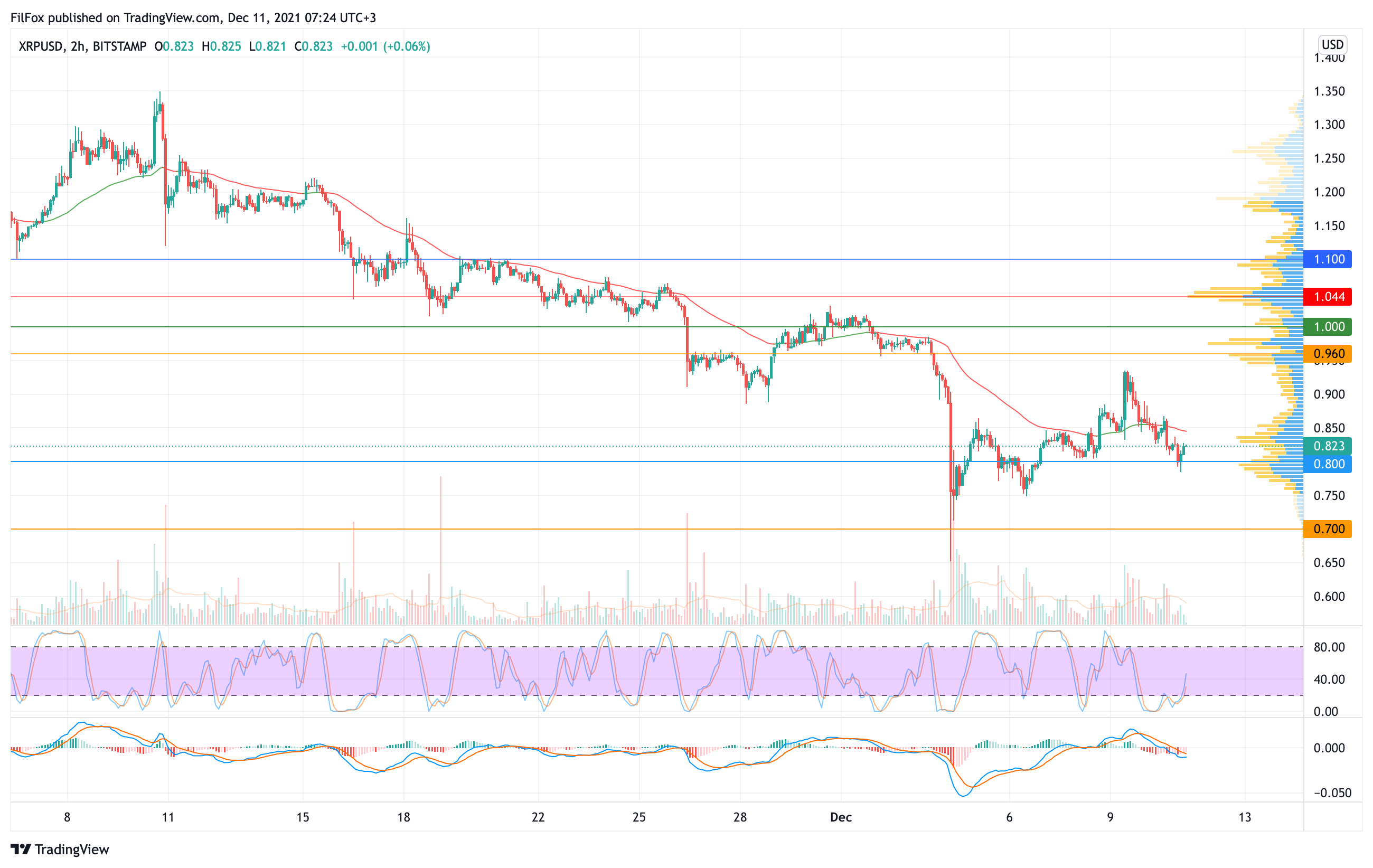Вчера утром цена XRP удерживалась в узкой консолидации в районе двухчасовой EMA55. Продавцы смогли продавить уровень средних цен. Днём покупатели попытались перехватить инициативу, но к завершению дня цена Ripple откатилась к поддержке 0.800 USD.