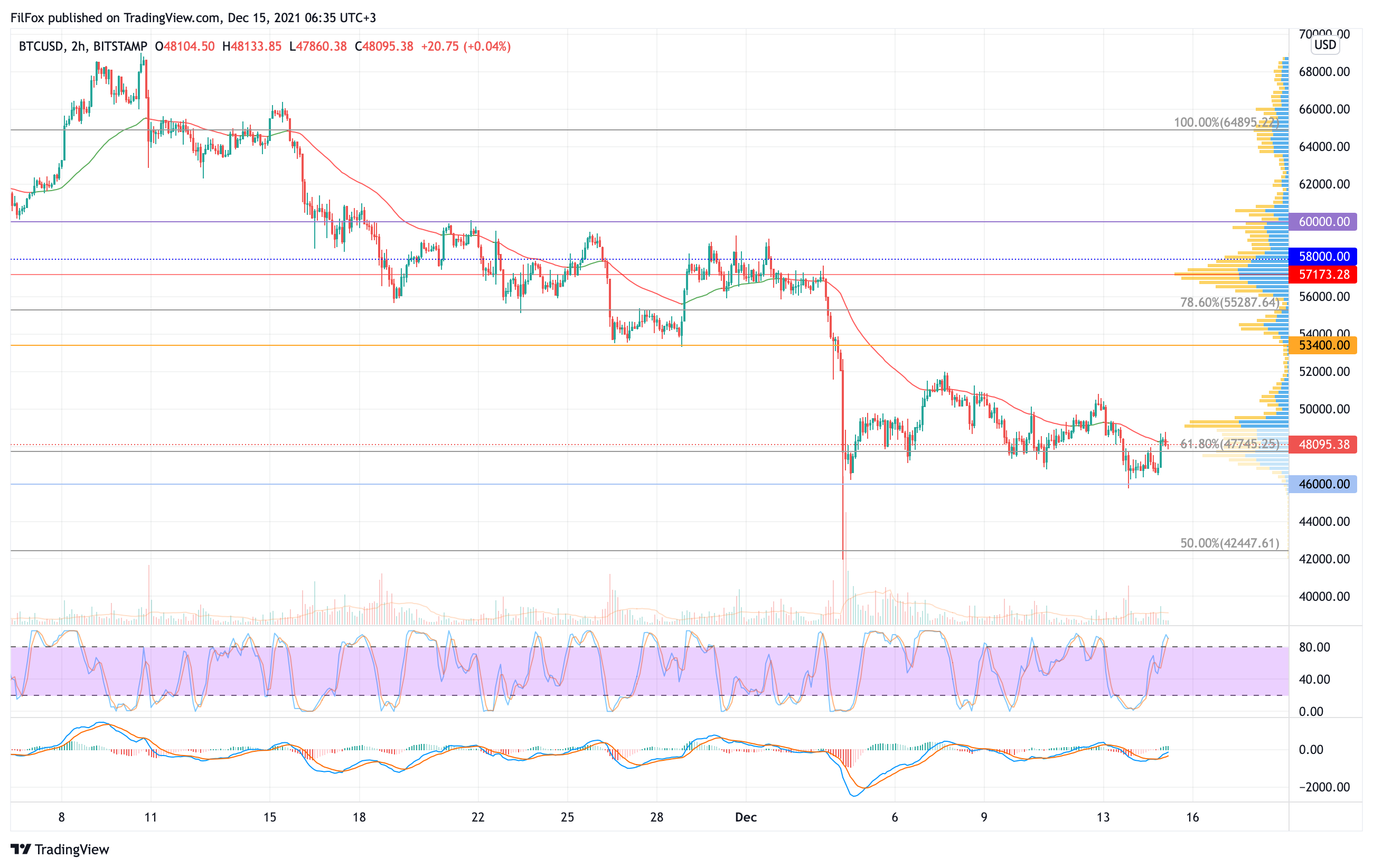 Вчера цена биткоина двигалась, преимущественно, в боковом коридоре, верхней границей которого выступал уровень 61.8% фибо (47745.25 USD). Днём цена проколола это сопротивление, но закрепиться выше него удалось только сегодня ночью. Покупатели смогли сформировать слабый бычий импульс, который угас в районе двухчасовой EMA55.
