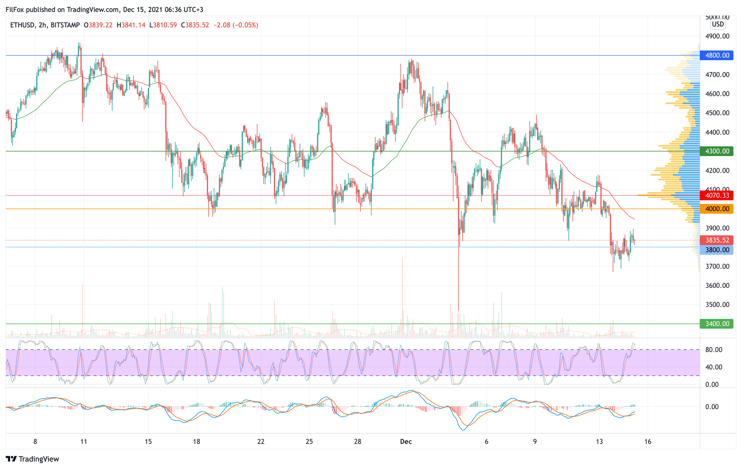 За минувшие сутки цена Ethereum смогла закрепиться выше голубого уровня 3800.00 USD, но до сих пор так и не смогла восстановиться выше уровня двухчасовой EMA55. Слабое восстановление не поддержано крупными объёмами.