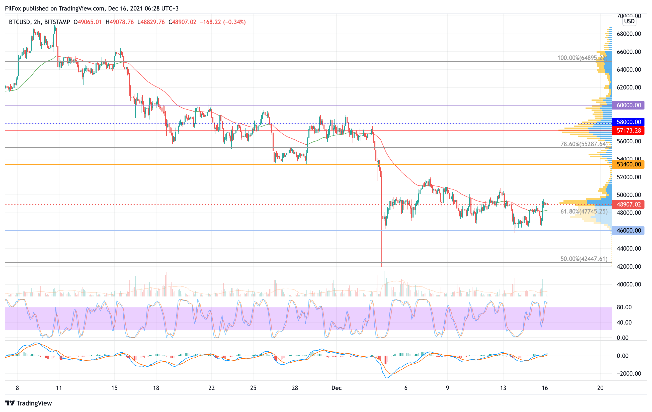 Вечером наблюдалось снижение пары в область 46500.00 USD, в которой покупателям удалось сформировать бычий импульс, достаточный для прорыва скользящей средней EMA55. Ночью зафиксирован локальный максимум в районе отметки 49500.00 USD.