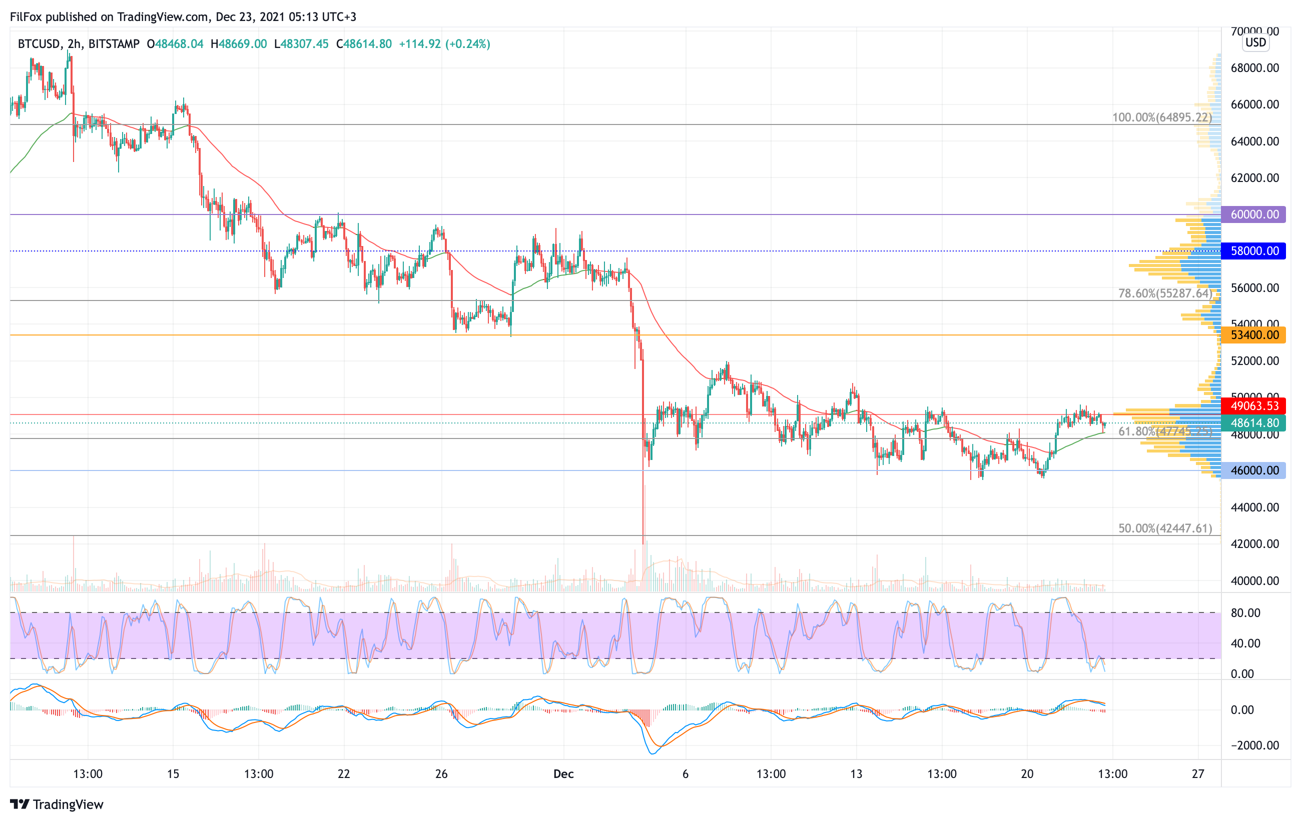 На дневном тайм-фрейме индикаторные линии Stoch RSI в зоне перекупленности. Возможно, после ре-еста психологического уровня 50000.00 USD, цена начнёт снижение и к завершению недели индикатор Stoch RSI вернётся в нейтральную зону. Первым сильным уровнем поддержки при таком снижении может стать пятидесятипроцентный уровень фибоначчи (42447.61 USD).