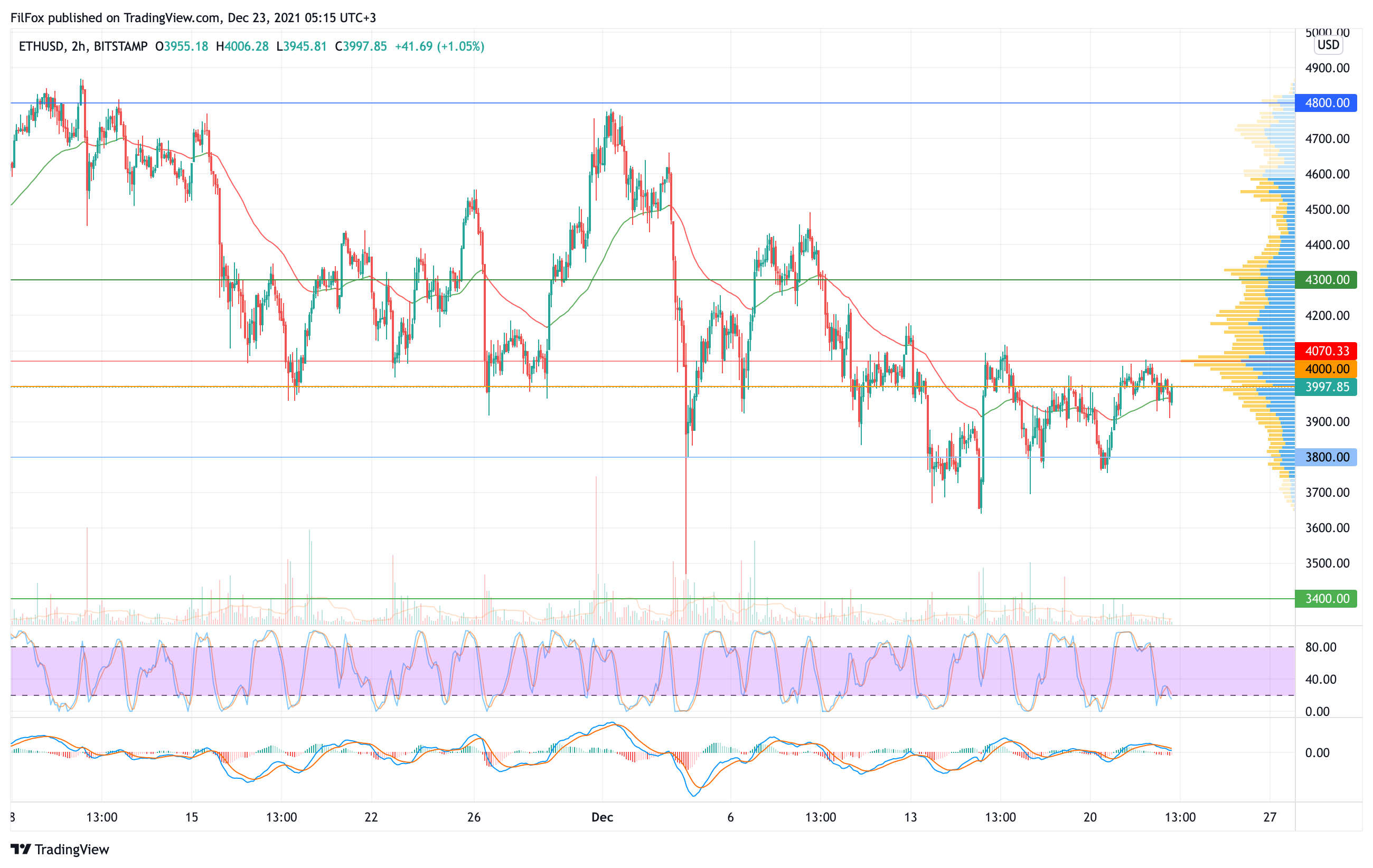 Вчера покупателям не удалось преодолеть индикаторную линию POC (4070.33 USD). Доминирование продавцов на рынке привело к откату цены Ethereum ниже психологической отметки 4000.00 USD.