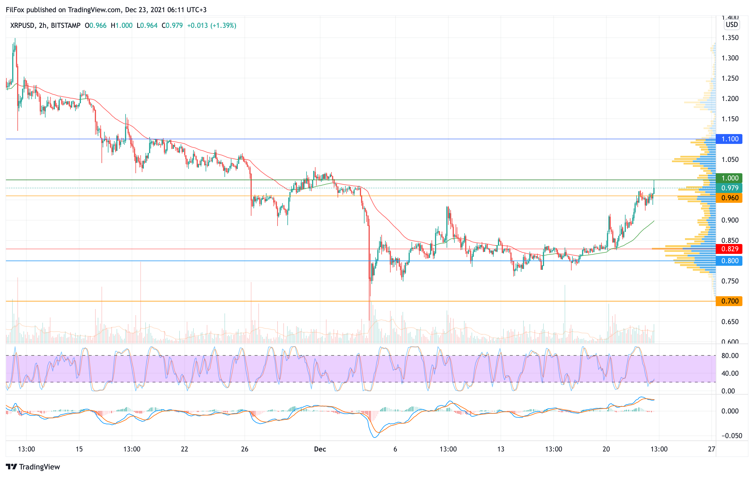 Вчера в первой половине дня продавцы оттеснили цену XRP ниже оранжевого уровня 0.960 USD, но вечером покупатели перехватили инициативу и постепенно вернули пару в область недельного максимума.