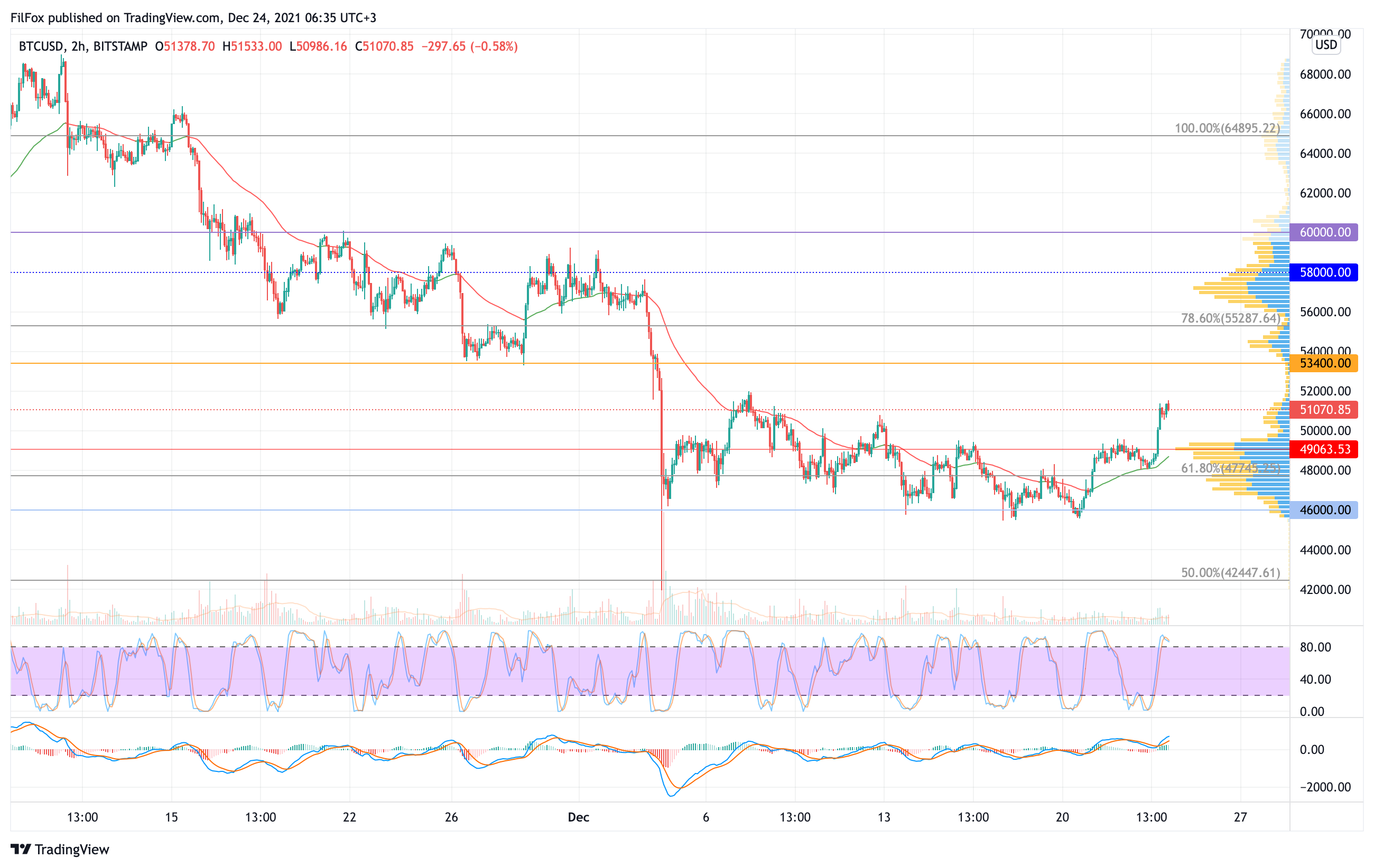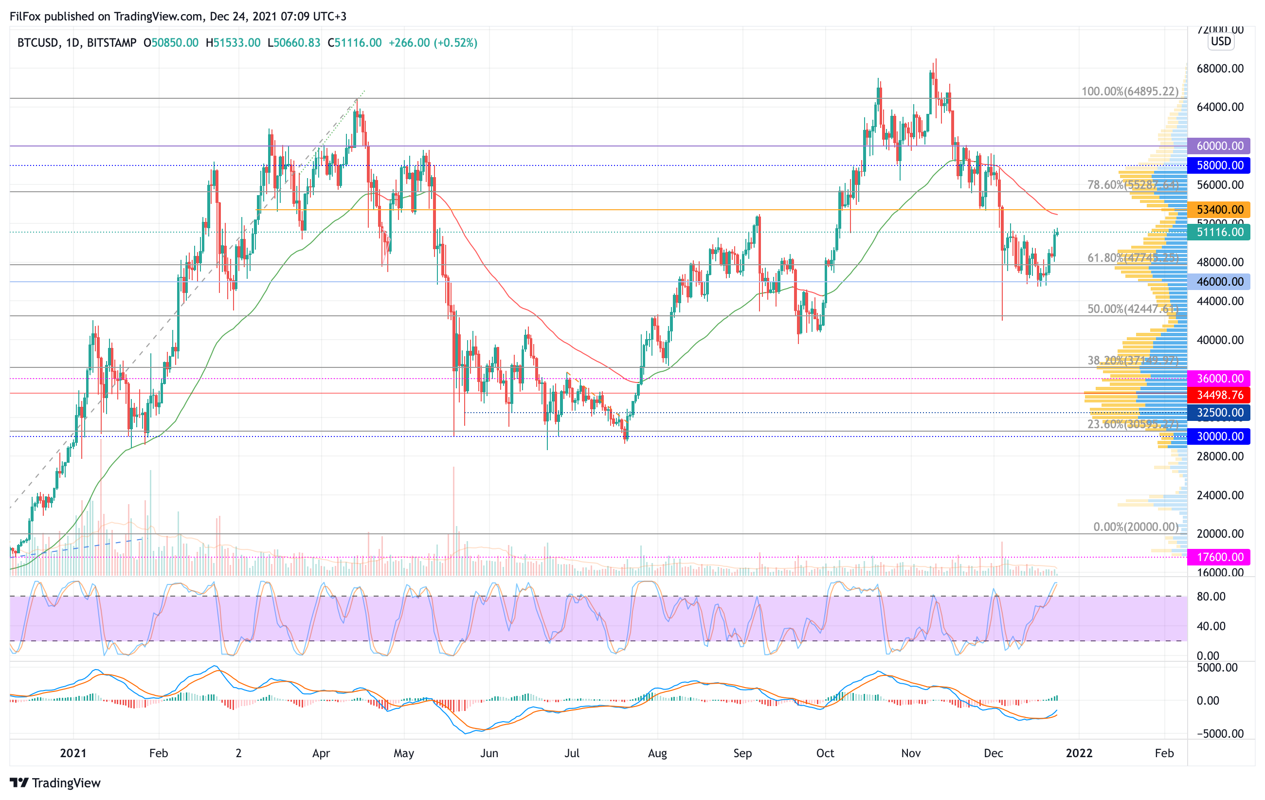 На дневном тайм-фрейме индикаторные линии Stoch RSI зашкаливают в зоне перекупленности. Если быки сегодня усилят натиск, то цена протестирует разворотный уровень 53400.00 USD.