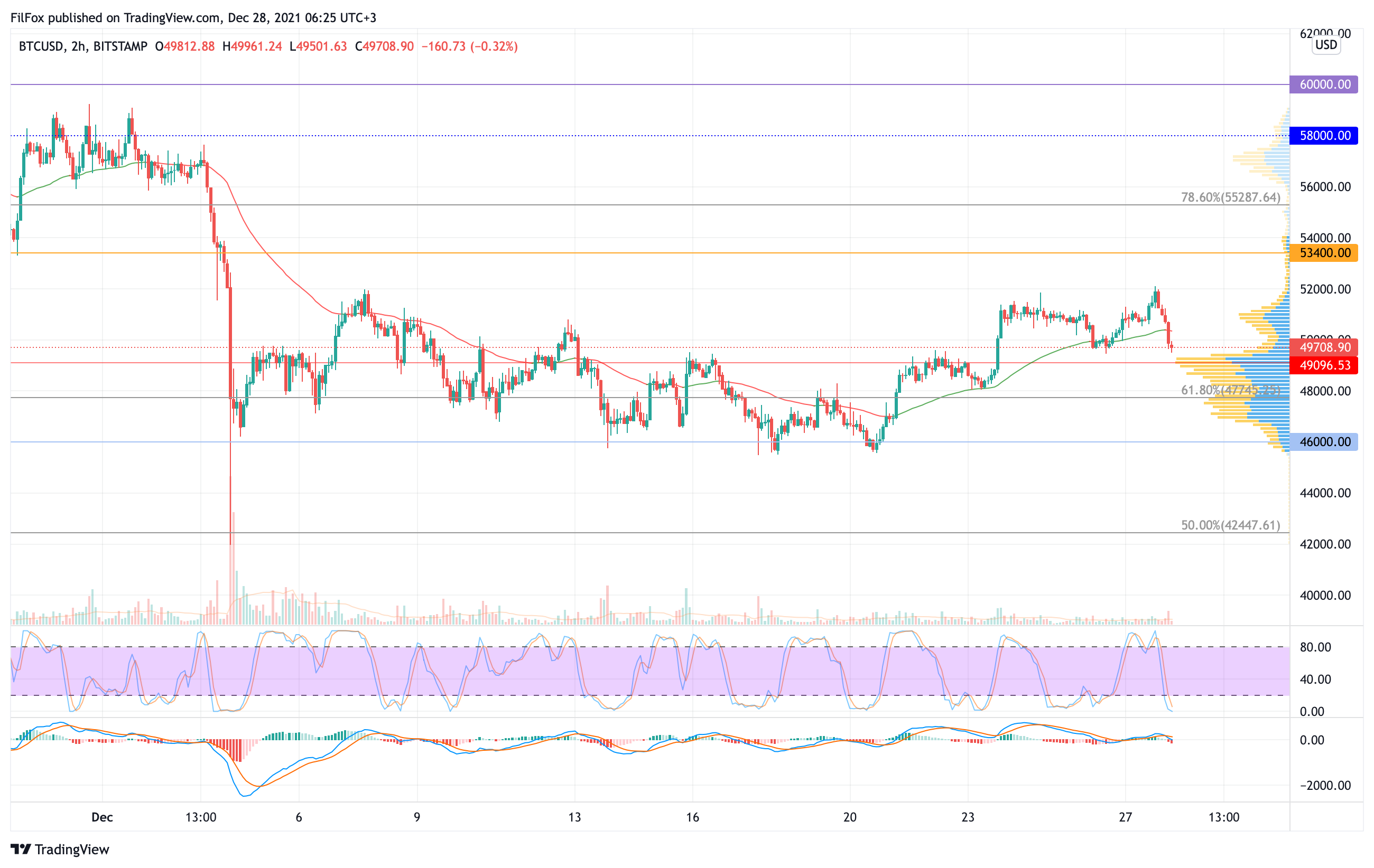 Вечером начался откат, в результате которого пара упала ниже психологической отметки 50000.00 USD. Сегодня снижение может продолжиться к индикаторной линии POC, и если она не остановит откат, то цена достигнет уровень 61.8% фибо (47745.25 USD).