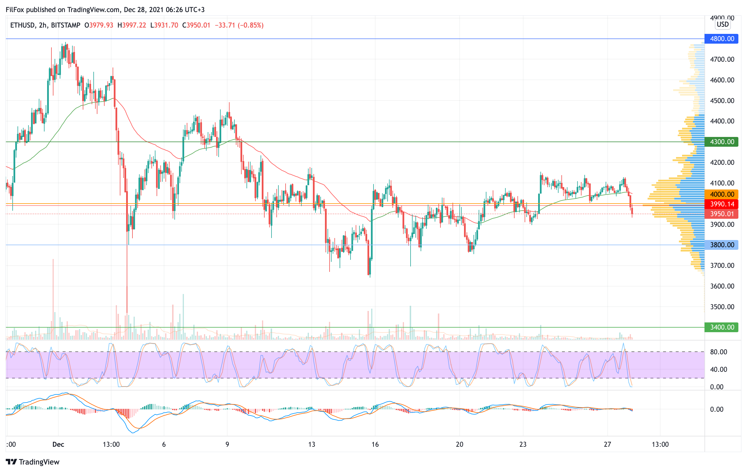 Вчера покупатели не смогли консолидировать усилия и сформировать бычий импульс. В результате дневных торгов, цена Ethereum не превышала отметку 4130.00 USD. В завершении дня медведи усилили натиск и цена эфира откатилась ниже психологической отметки 4000.00 USD.