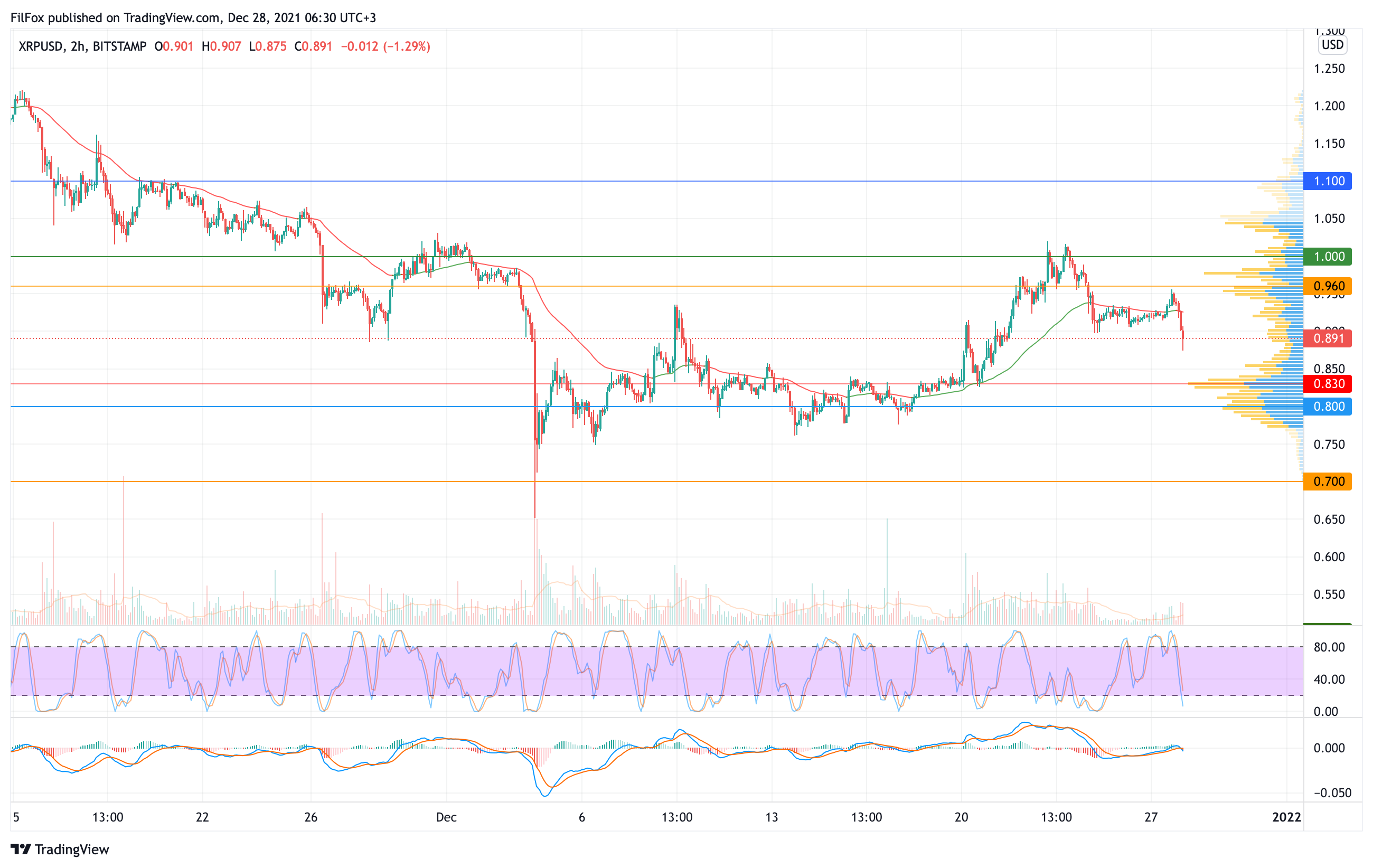 Вчера цена XRP попыталась продолжить рост и преодолела сопротивление двухчасовой EMA55. Рост не был поддержан крупными объёмами и покупателям не удалось протестировать сопротивление 0.960 USD.