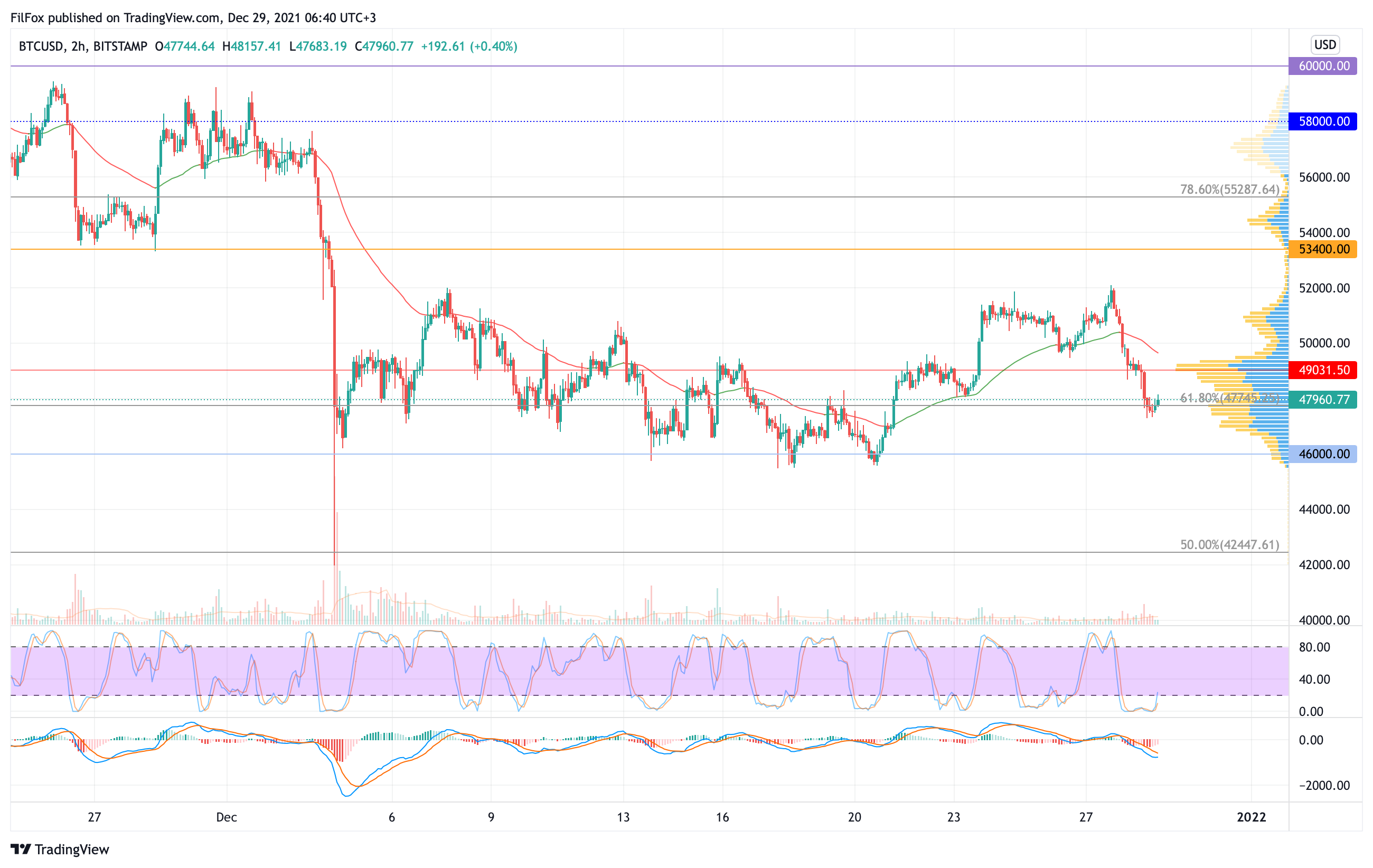 Вчера утром индикаторная линия POC приостановила снижение цены BTC. Некоторое время пара держалась в узком боковом коридоре, но во второй половине дня давление продавцов усилилось и падение продолжилось к уровню 61.8% фибо (47745.25 USD).