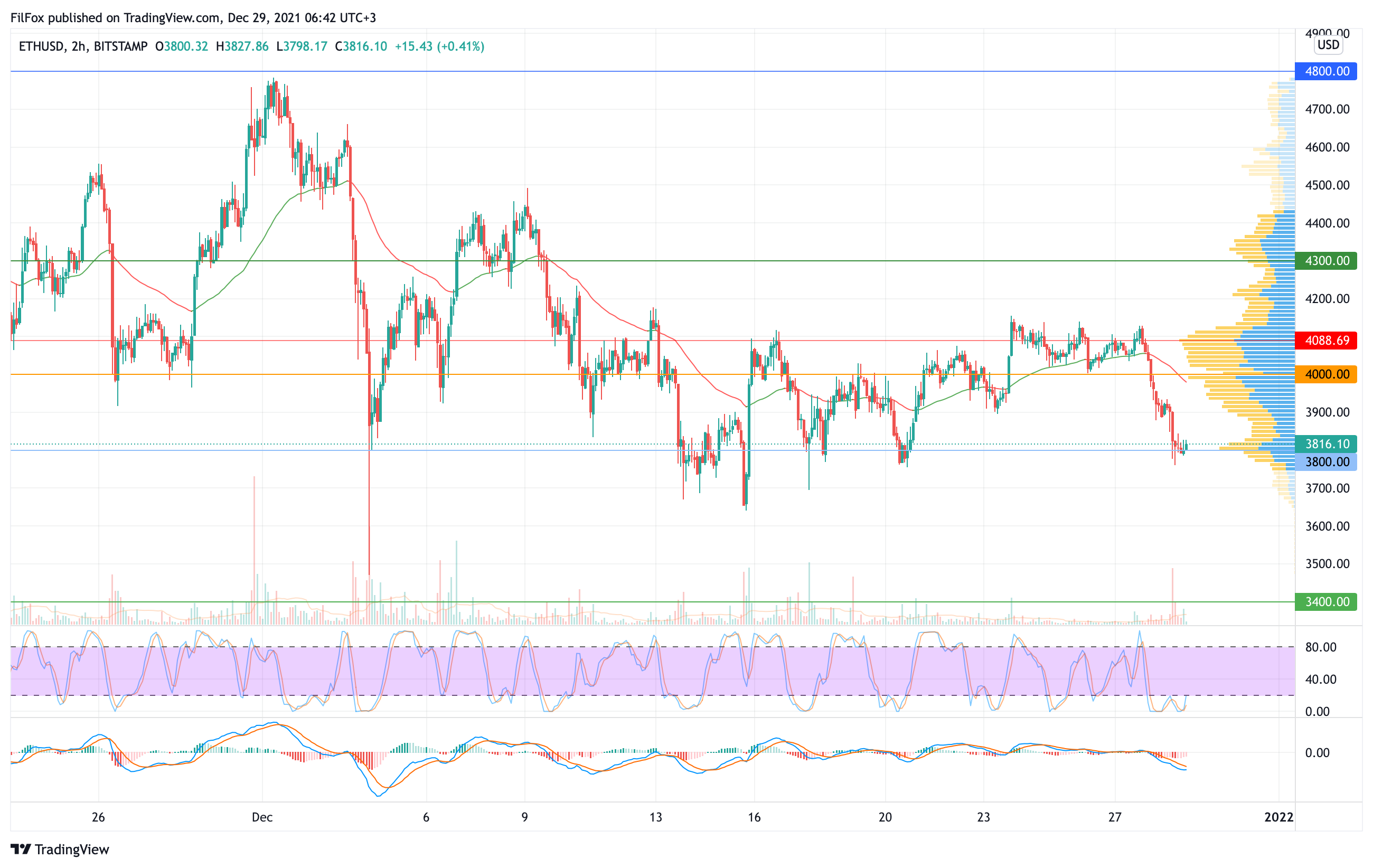 Вчера снижение цены Ethereum продолжилось и достигло поддержки 3800.00 USD. Ночью объёмы продаж сократились и до утра пара продержалась в узкой боковой консолидации.