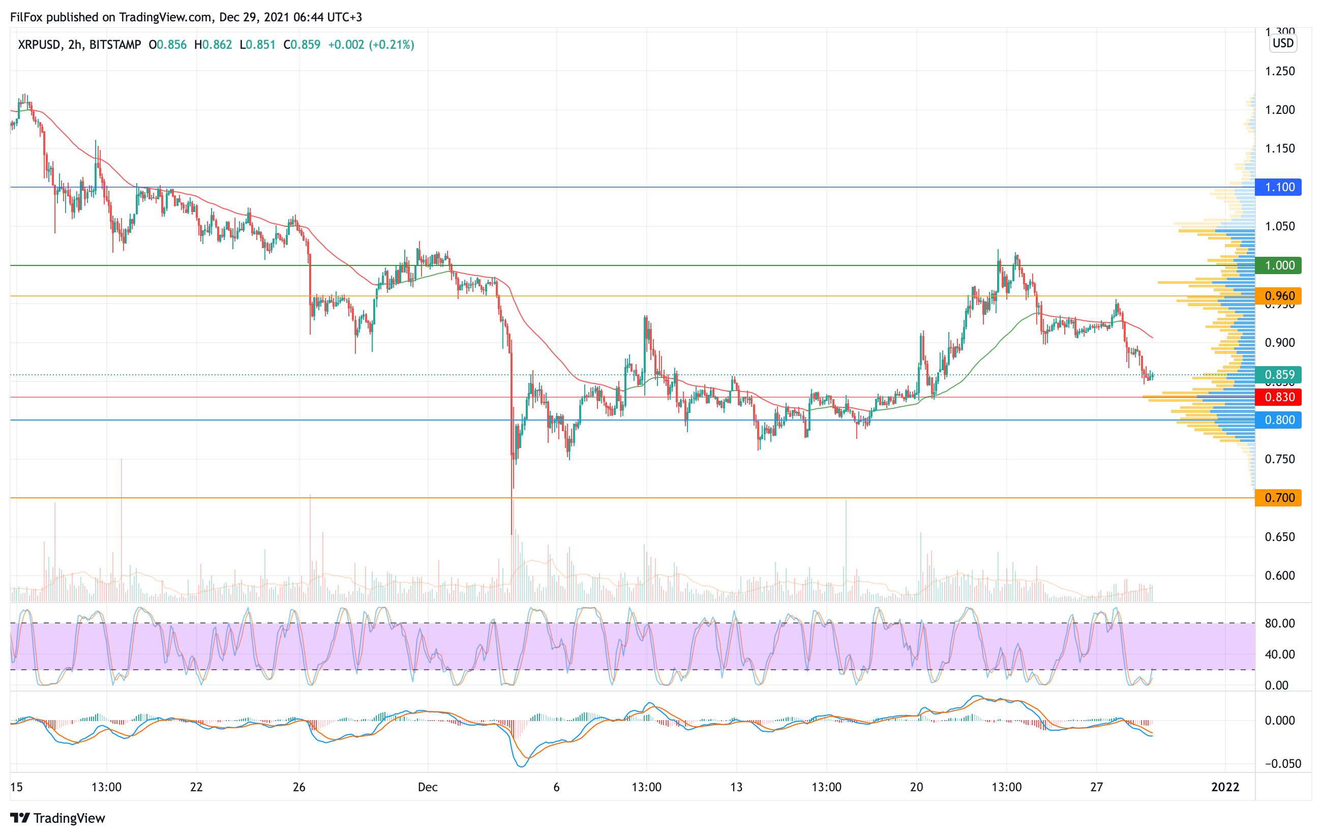 Вчера в первой половине дня покупатели не смогли добиться какого-то существенного восстановления цены XRP, и после обеда снижение продолжилось. В завершении дня пара протестировала уровень 0.850 USD.