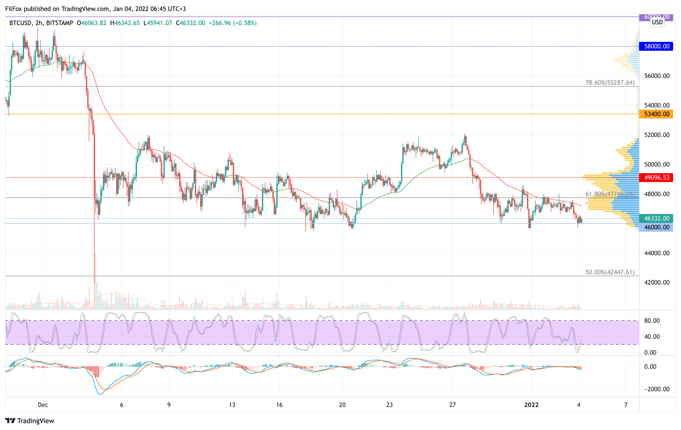 Вчера цена BTC не смогла преодолеть сопротивление двухчасовой EMA55 и опять откатилась к поддержке 46000.00 USD.