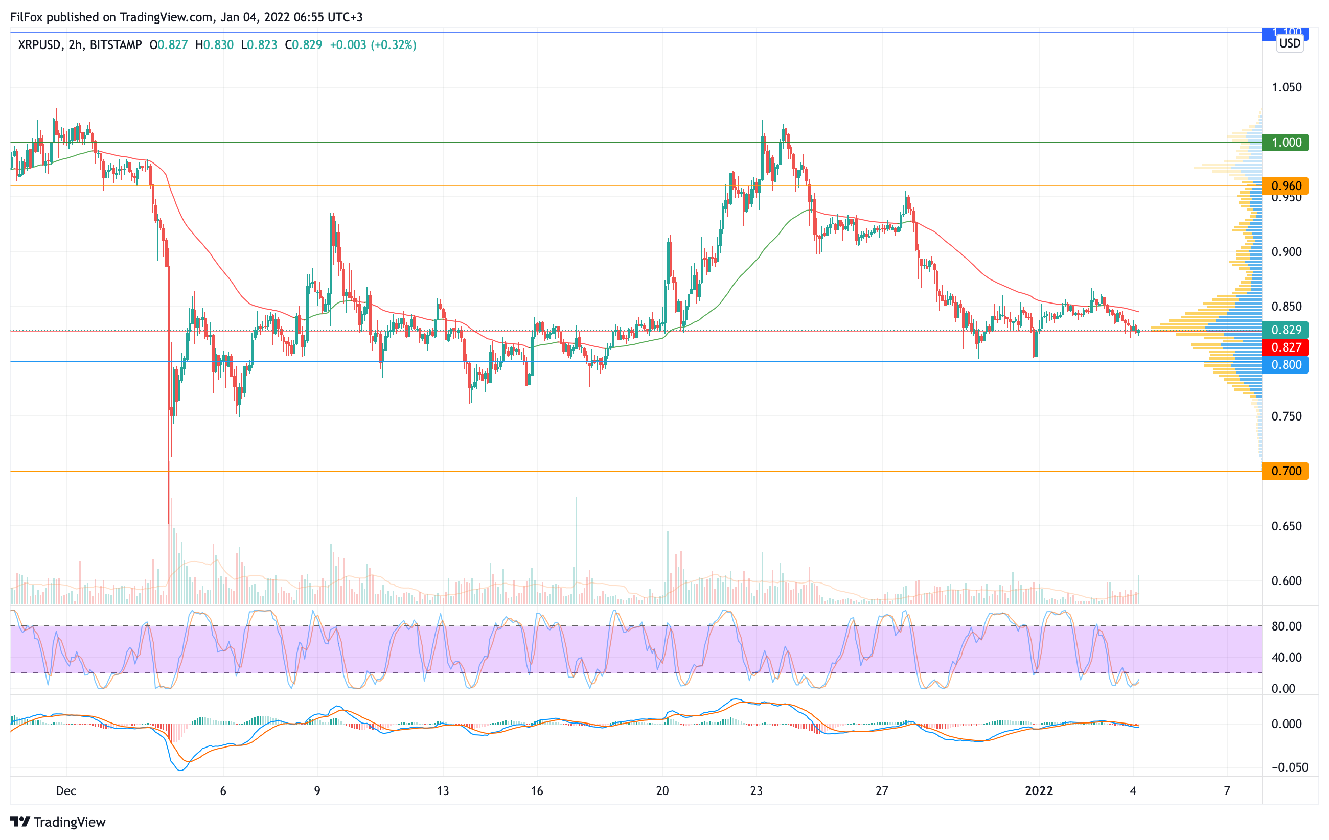 Вчера утром покупатели не смогли восстановить цену XRP выше двухчасовой EMA55. Несмотря на прессинг со стороны продавцов пара смогла удержаться на линии POC (0.828 USD).
