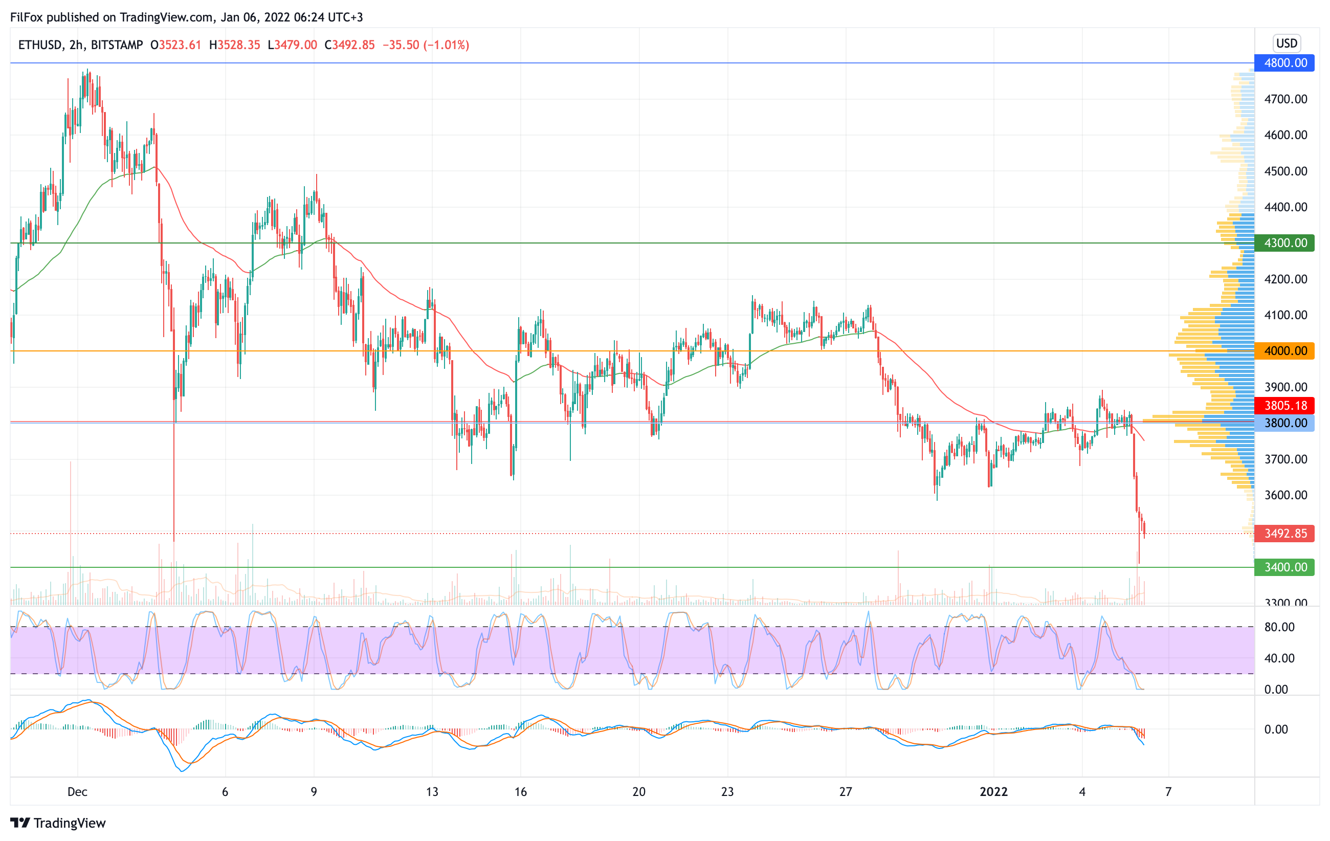Ночью цена эфира упала к зелёной поддержке 3400.00 USD, установив минимум в районе отметки 3410.00 USD. Несмотря на небольшой отскок, полагаем, что сегодня пара протестирует уровень 3400.00 USD и замедлит снижение в боковом диапазоне с нижней границей в виде зелёной поддержки.