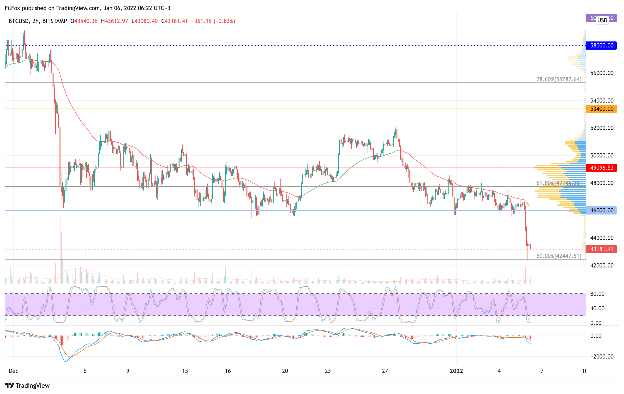 Вечером в области средних цен давление медведей быстро усилилось, и к концу дня цена BTC откатилась ниже отметки 44000.00 USD, а ночью пара протестировала уровень 50% фибо (42447.61 USD).