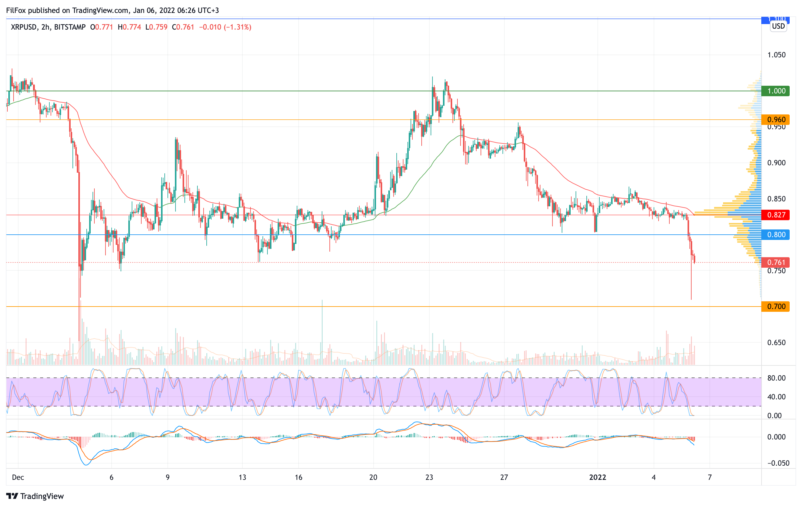Вчера пара XRP/USD не смогла удержаться в узкой консолидации на линии POC и откатилась ниже поддержки 0.800 USD. Сегодня ночью пара вплотную подошла к оранжевой поддержке 0.700 USD, но когда объёмы продаж сократились цена XRP отскочила в район отметки 0.770 USD.