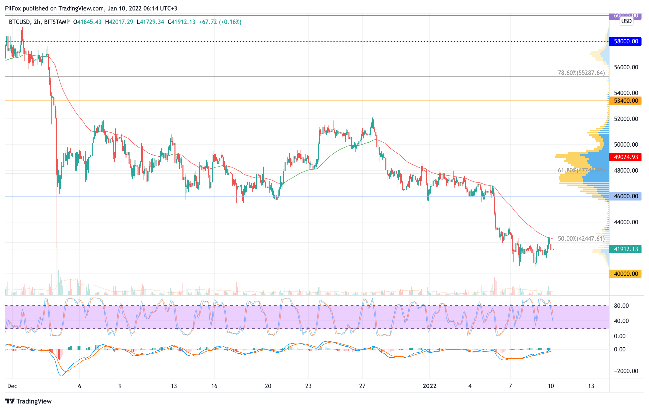 В воскресенье вечером быки прокололи верхнюю границу бокового диапазона в виде пятидесятипроцентного уровня фибоначчи (42447.61 USD), но преодолеть двухчасовую EMA55 у них не хватило сил. На сегодняшнее утро пара вернулась в боковой диапазон.