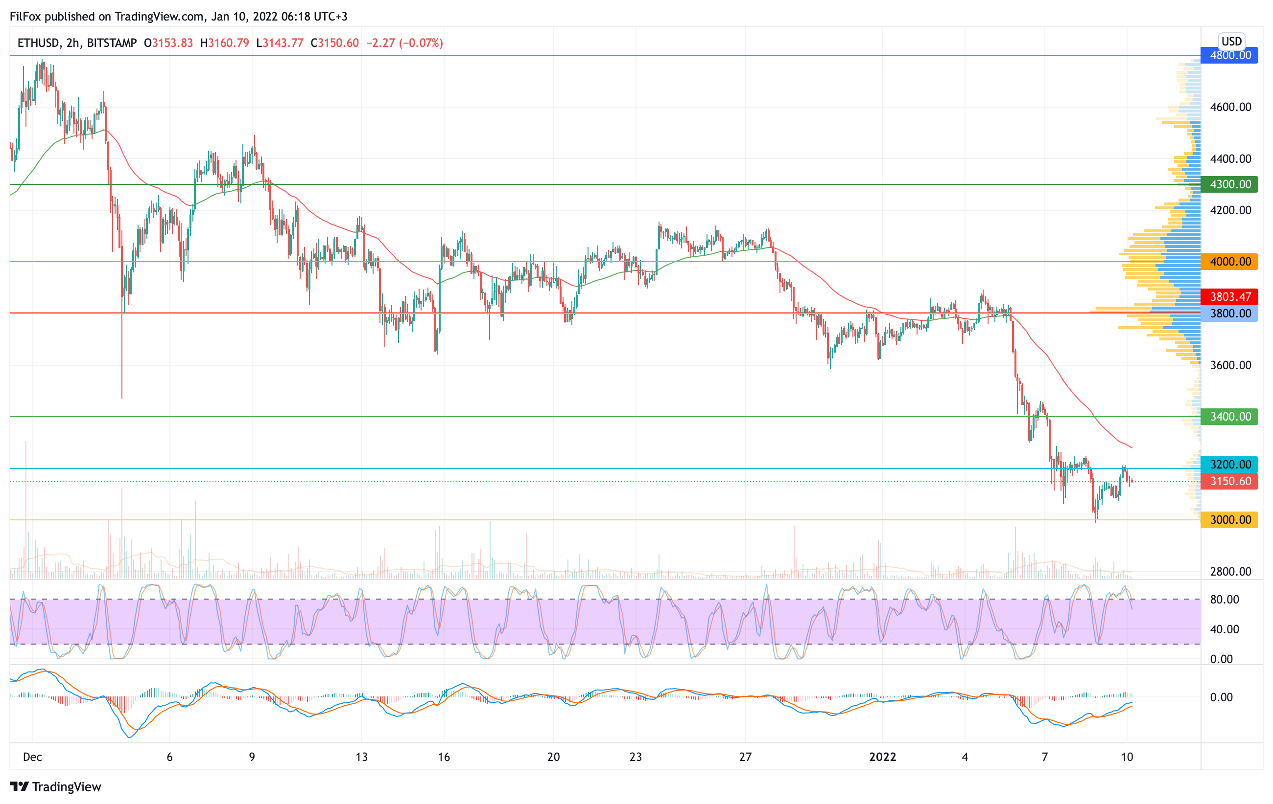 В воскресенье цена Ethereum смогла восстановиться к уровню 3200.00 USD, который пока не позволяет паре продолжить рост в область двухчасовой EMA55. Сегодня быки опять попытаются прорваться выше сопротивления 3200.00. USD и протестировать скользящую среднюю EMA55.