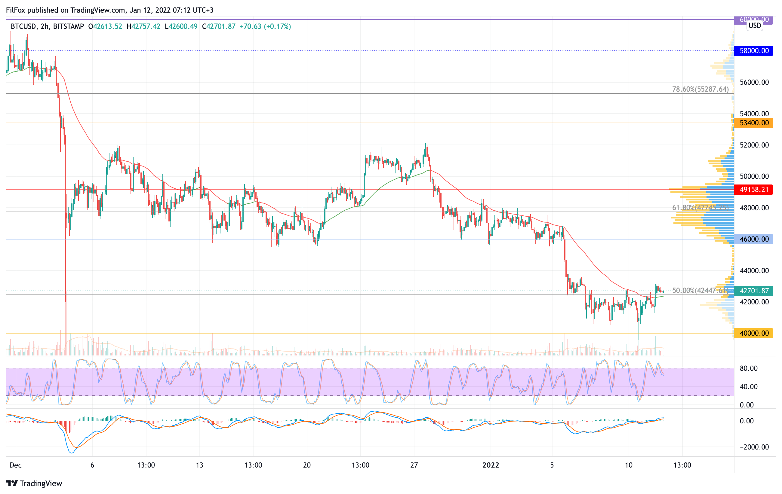 Вчера покупатели со второй попытки смогли преодолеть сопротивление двухчасовой EMA55 и закрепиться выше уровня 50% фибо (42447.61 USD).