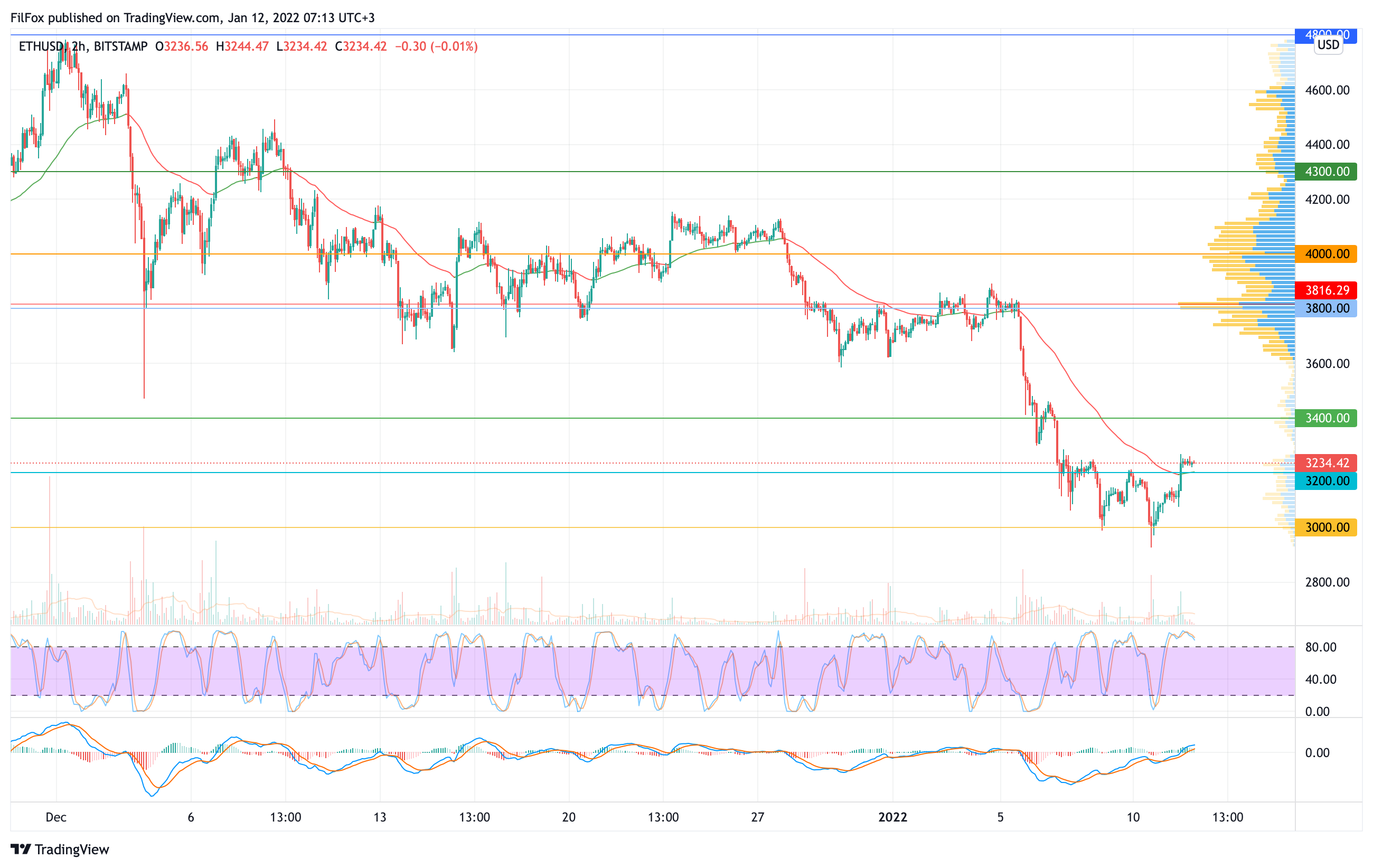Вчера во второй половине дня цена Ethereum пробила сопротивление скользящей средней EMA55 и до сегодняшнего утра закрепилась в узкой консолидации в районе отметки 3235.00 USD.