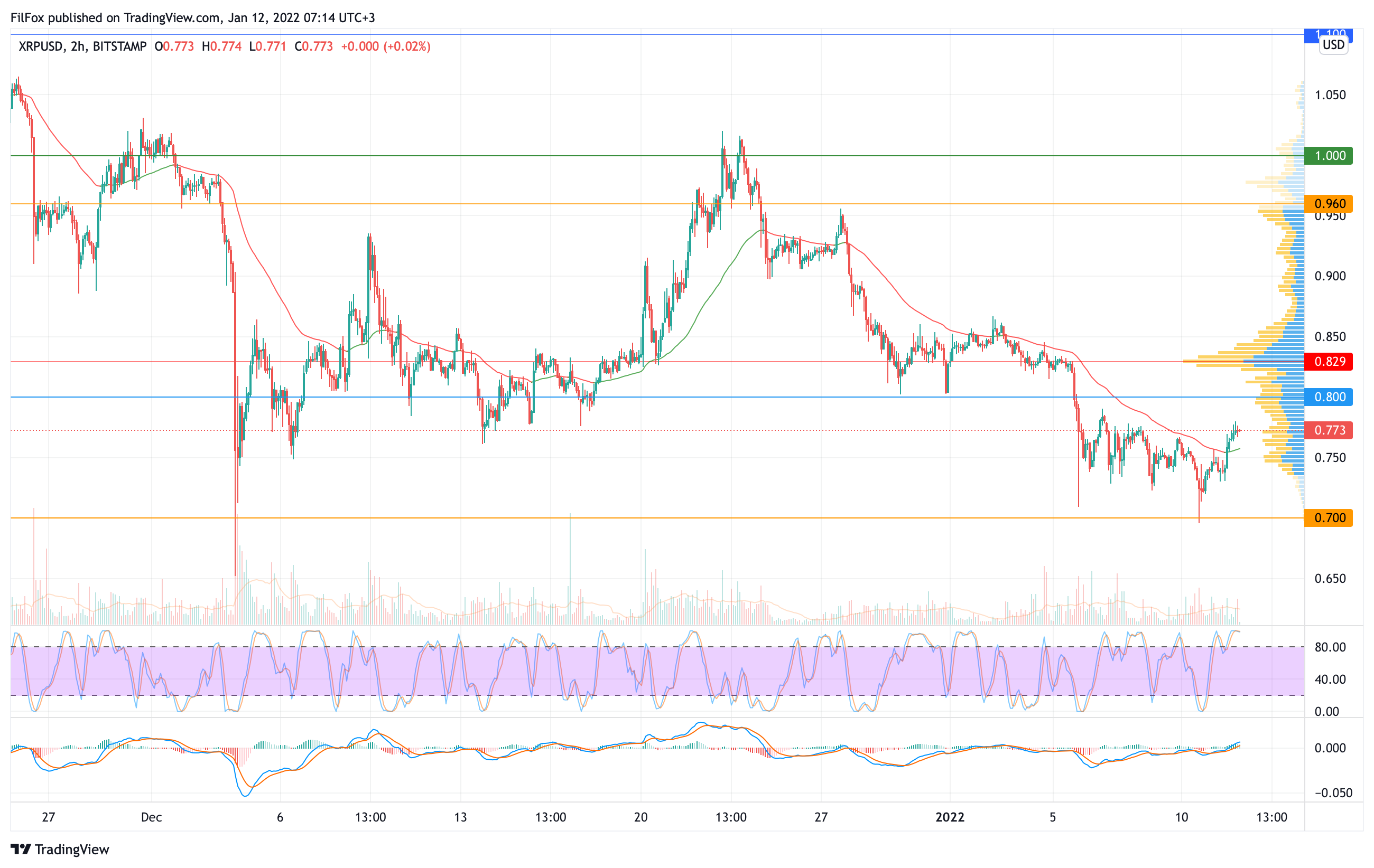 Вчера цена XRP восстановилась выше двухчасовой EMA55. В конце дня пара закрепилась над уровнем средних цен и сегодня ночью слабый рост продолжался к отметке 0.777 USD.