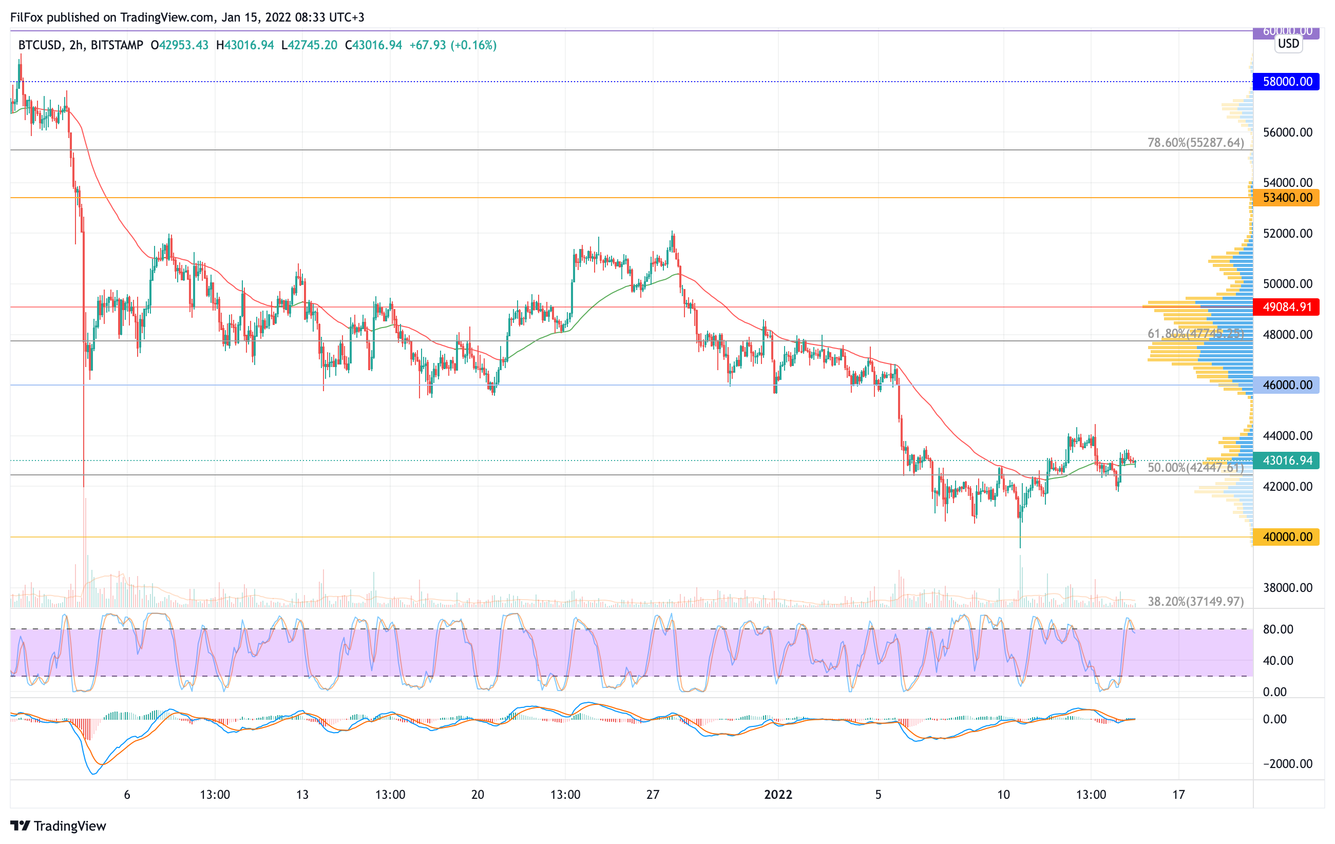Вчера утром цена биткоина консолидировалась чуть выше уровня 50% фибо (42447.61 USD). Чтобы занять доминирующую позицию на рынке медведи попытались продавить поддержку пятидесятипроцентного уровня фибоначчи.