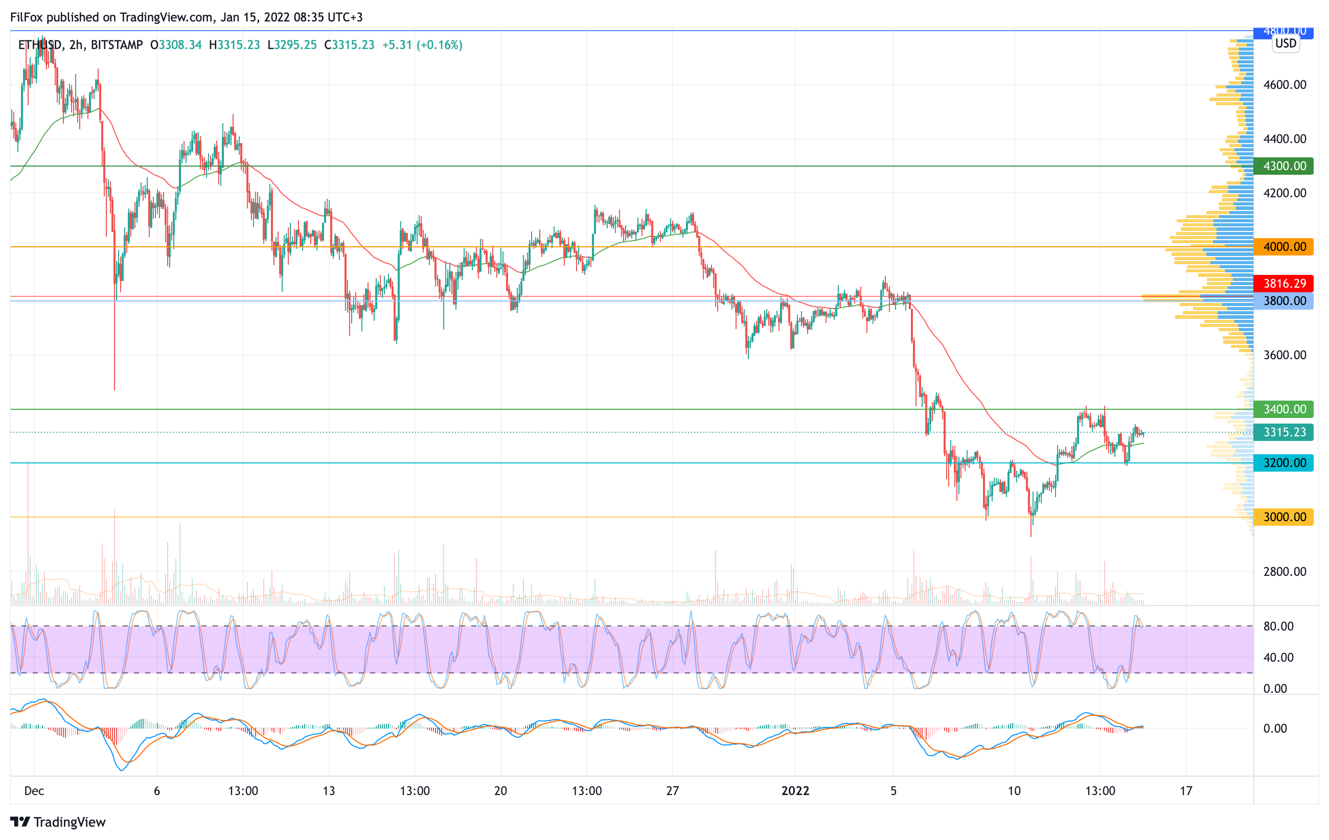 Вчера продавцы прижали цену Ethereum к уровню 3200.00 USD, но он развернул пару на восстановление. До конца дня покупатели восстановили цену эфира выше двухчасовой EMA55, однако полностью возвратить пару к прежнему уровню сопротивления 3400.00 USD - пока не удалось.