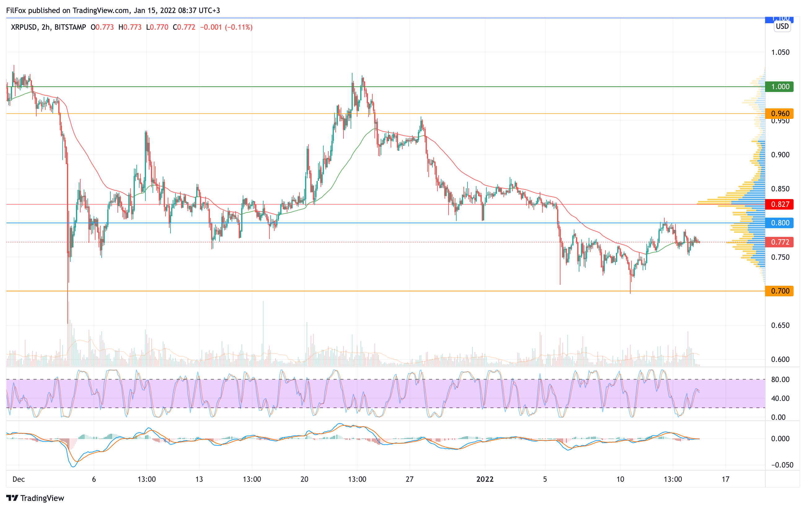 На сегодняшнее утро боковой коридор существенно сузился и цена буквально «улеглась» на двухчасовую EMA55. Если на рынке будут доминировать оптимистические настроения, то и цена Ripple сможет продолжить восстановление выше сопротивления 0.800 USD.