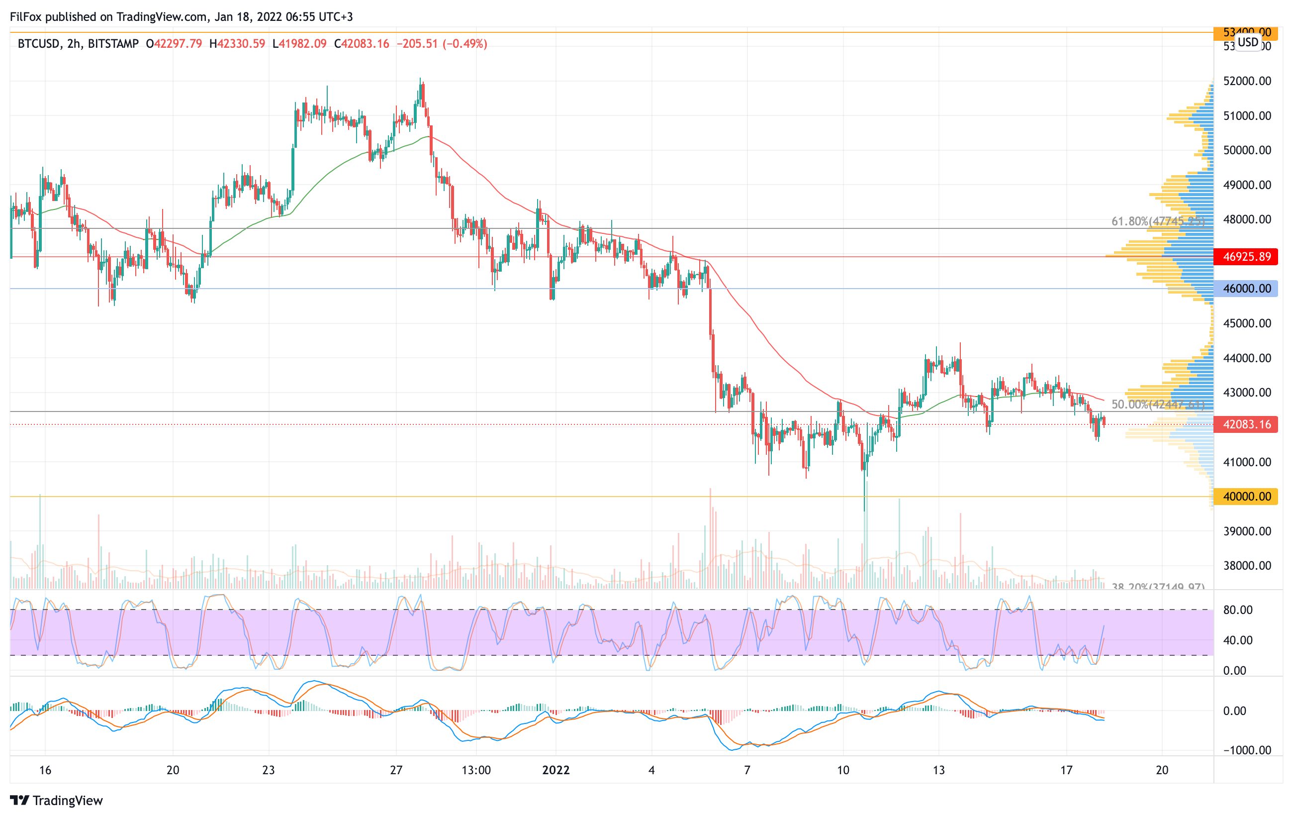 Вчера продавцы оттеснили цену биткоина ниже двухчасовой EMA55, а вечером прорвали поддержку 50% фибо (42447.61 USD). В завершении дня локальный минимум установлен в районе отметки 41580.00 USD.
