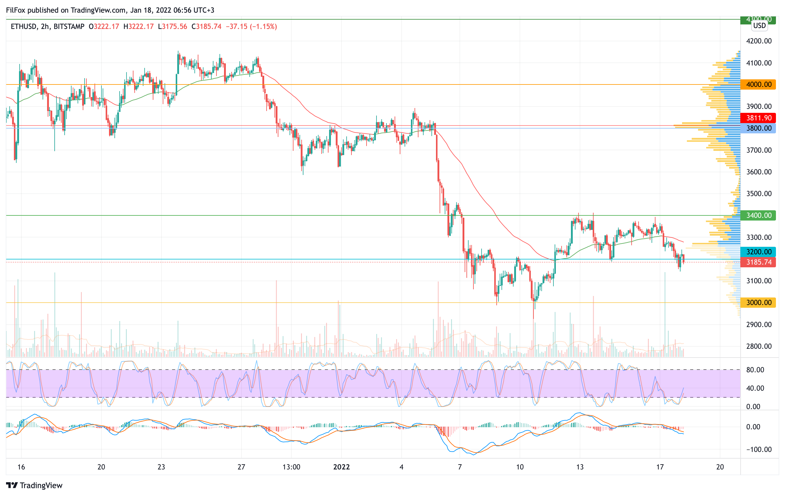 Вчера утром медведи прорвали уровень средних цен, а к концу дня цена Ethereum опустилась ниже поддержки 3200.00 USD. Минимум обозначен в районе отметки 3140.00 USD.