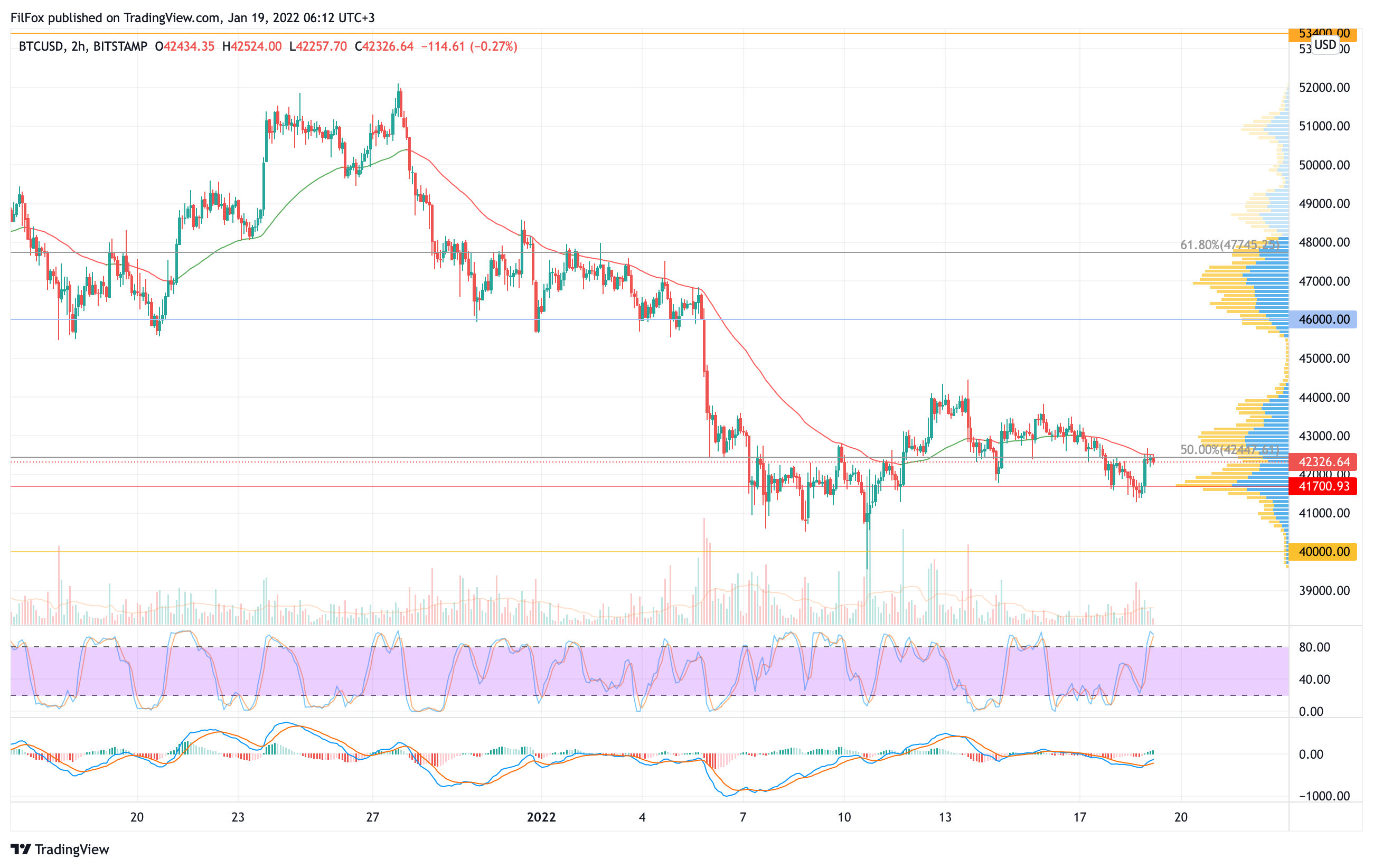 Полагаем, что быки не смогут сегодня прорваться выше 50% фибо (42447.61 USD), и снижение продолжится к психологической поддержке 40000.00 USD.