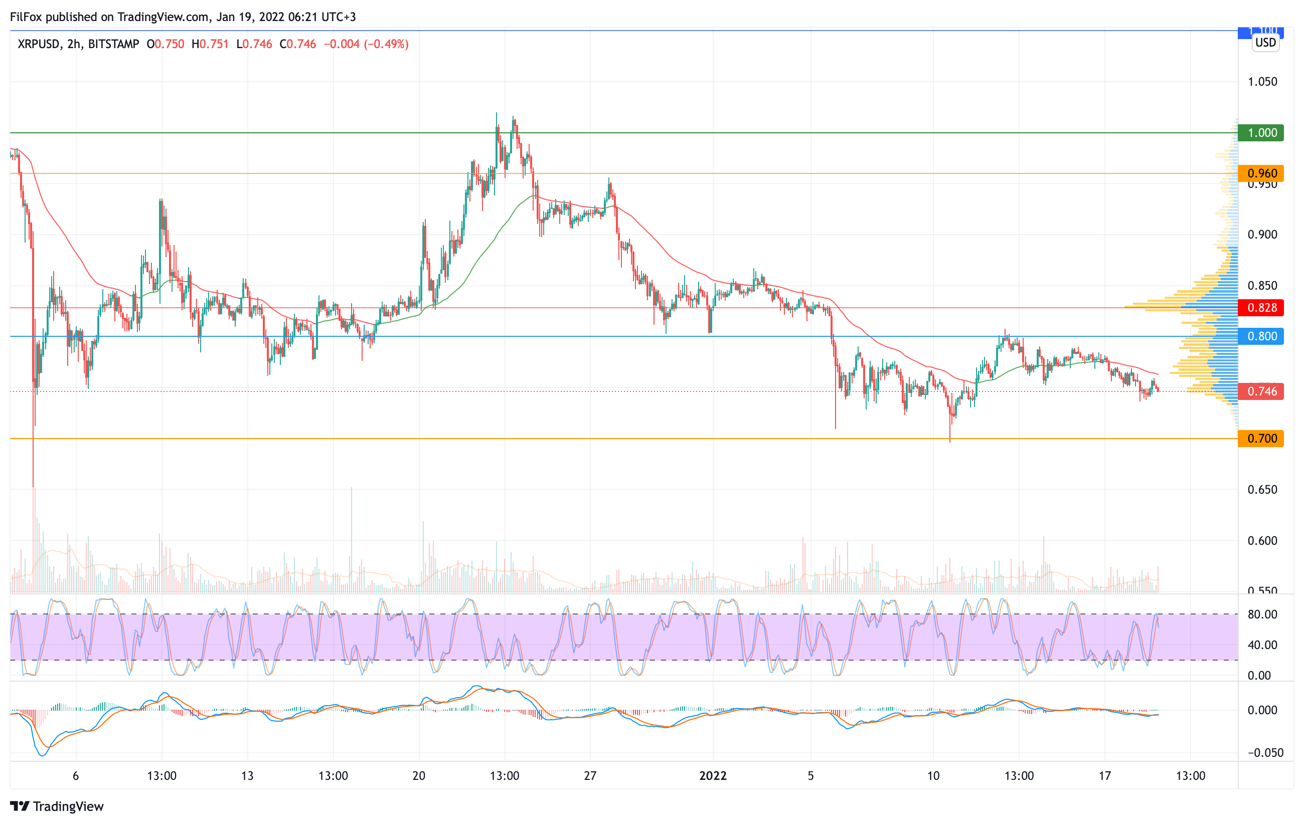 Сегодня ночью медвежий импульс вернул цену Ripple ниже отметки 0.740 USD. Полагаем, что в течение дня снижение будет продолжаться к оранжевой поддержке 0.700 USD.