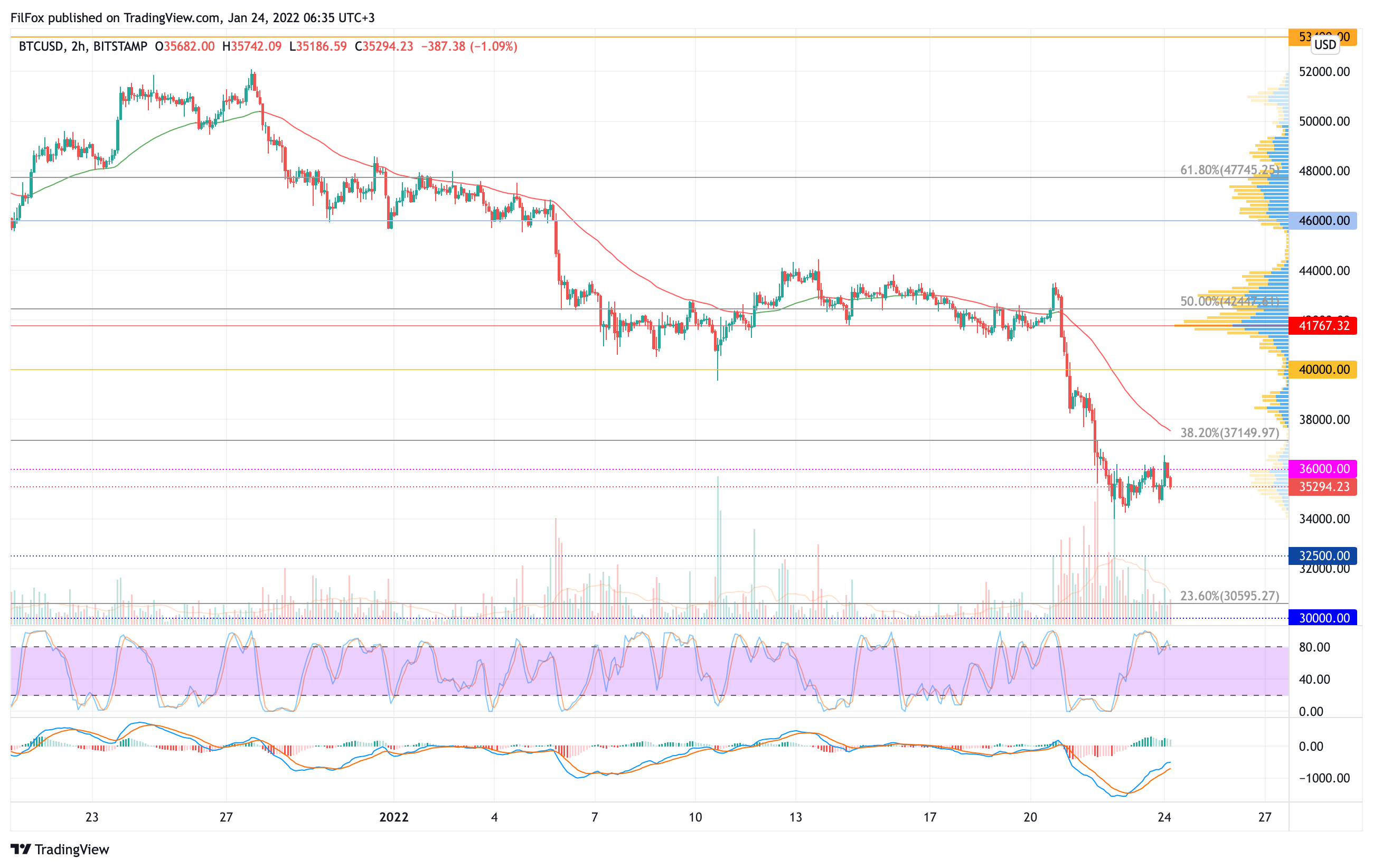 В прошедшую субботу цена биткоина протестировала уровень 34000.00 USD и приостановила снижение. В завершении минувшей недели пара смогла восстановиться к сопротивлению 36000.00 USD.