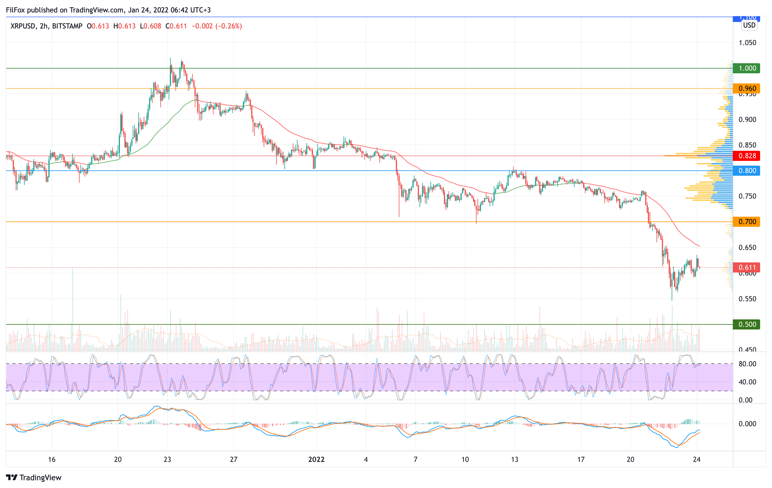На прошедших выходных снижение цены XRP замедлилось в районе отметки 0.580 USD, но медведям ещё удалось обновить январский минимум в точке 0.546 USD.