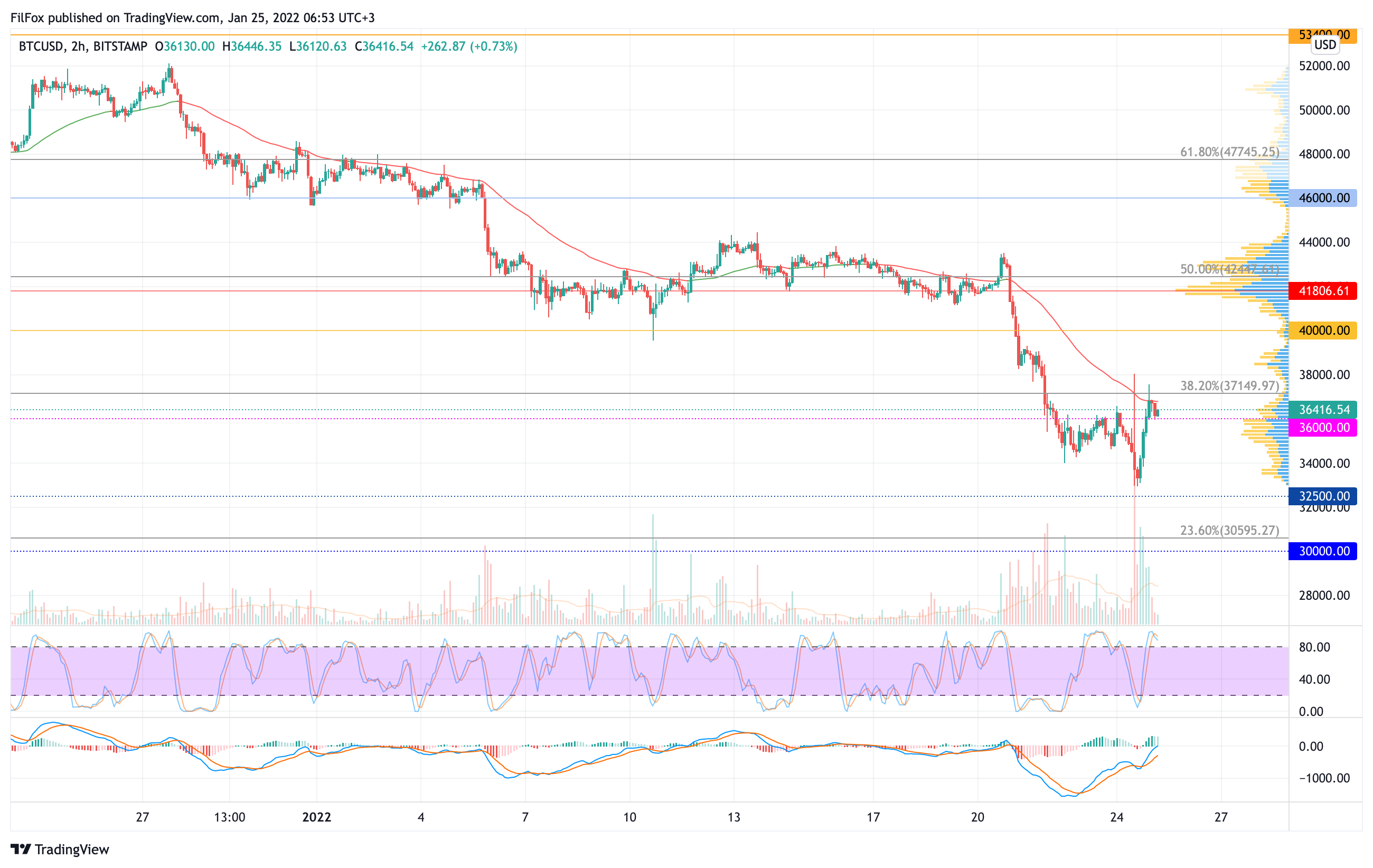 Вчера в первой половине дня снижение цены биткоина продолжилось к новому январскому минимуму. Медведям не удалось протестировать поддержку 32500.00 USD, поэтому минимум оказался в районе отметки 32950.00 USD.