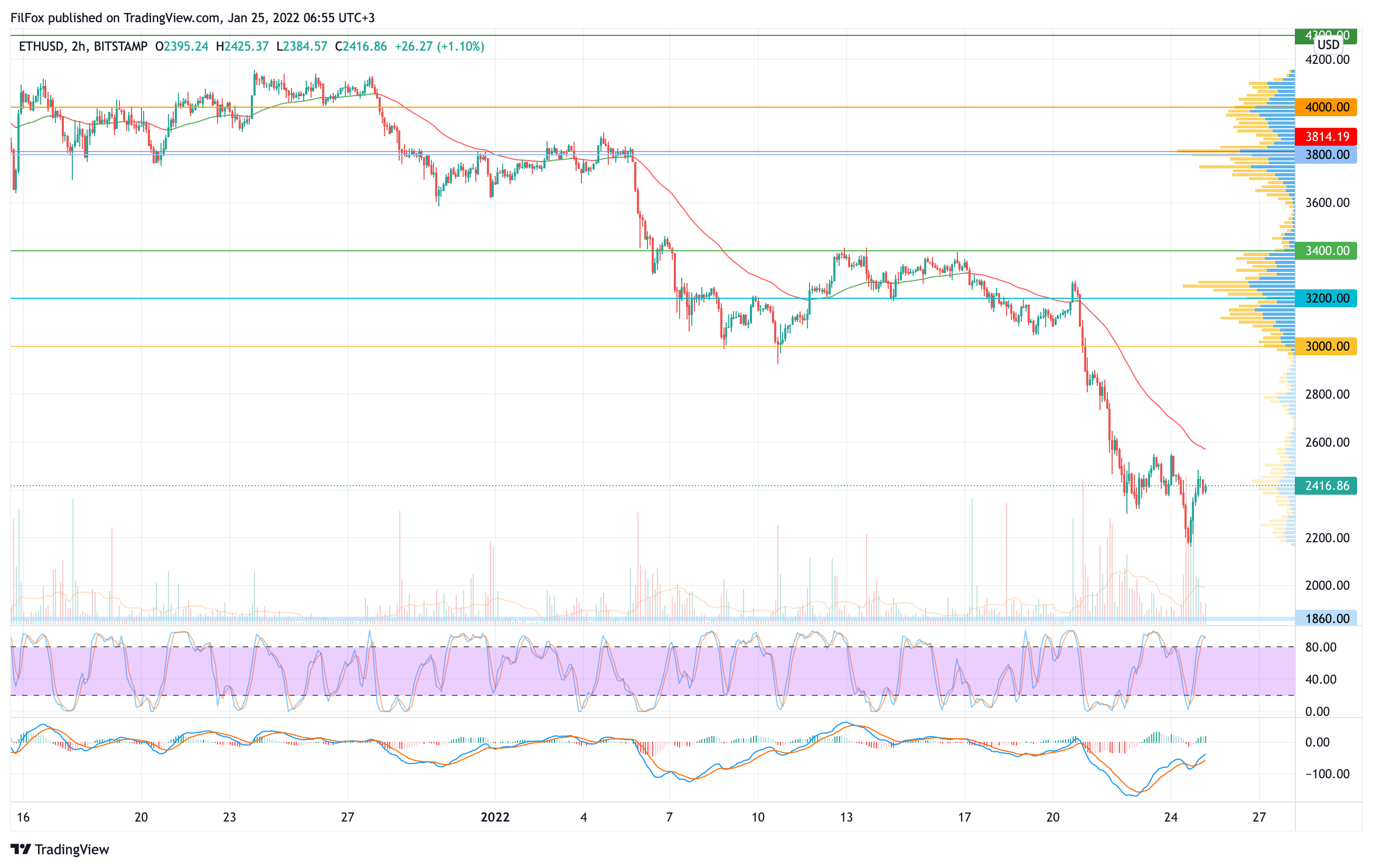 Вчера медведи оттеснили цену Ethereum в область 2200.00 USD. Месячный минимум обозначен в точке 2160.00 USD.