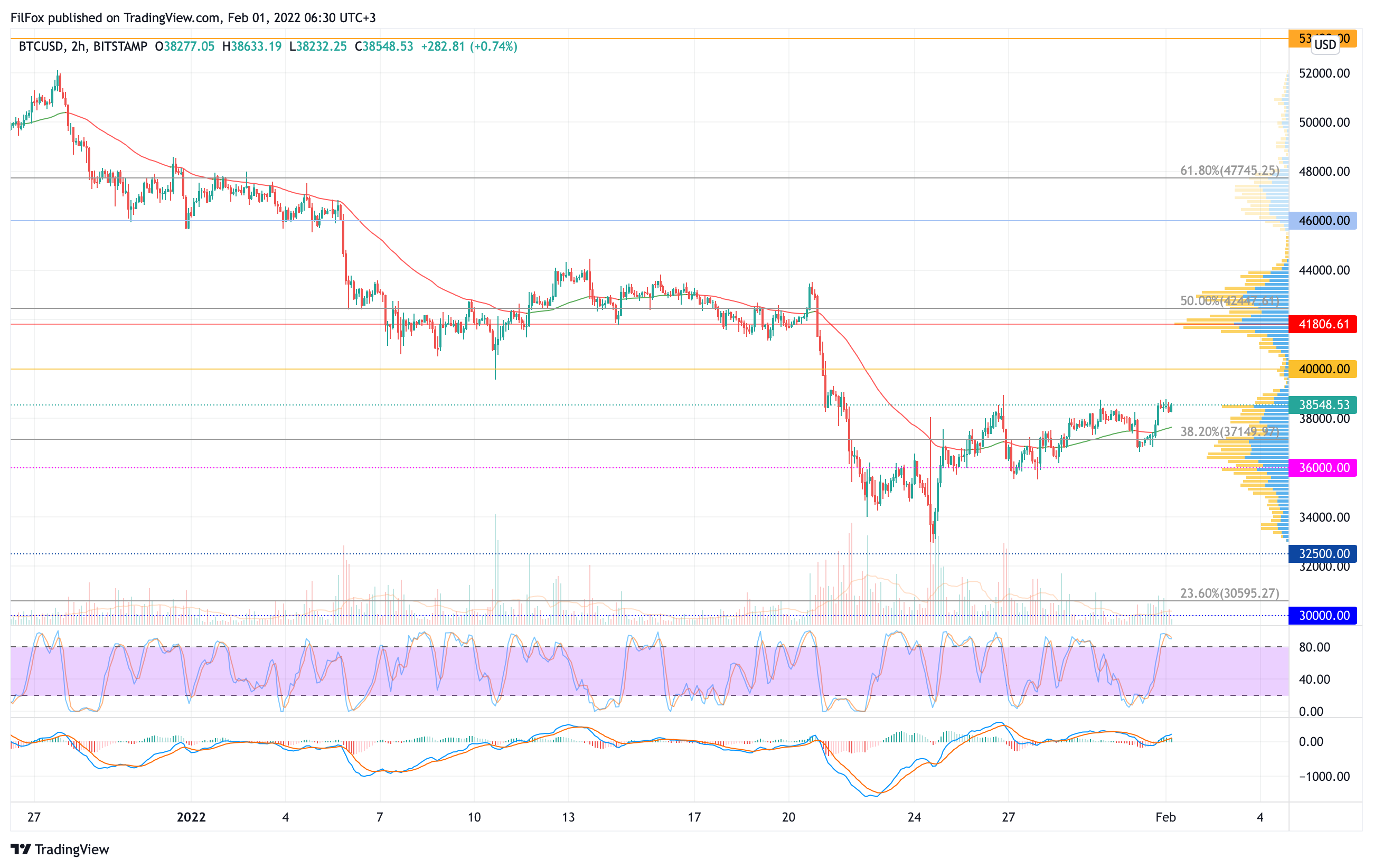 Сегодня ночью снижение приостановилось и цена BTC до утра консолидировалась в узком боковом диапазоне. У быков по-прежнему не хватает сил пробиться выше сопротивления 38900.00 USD.