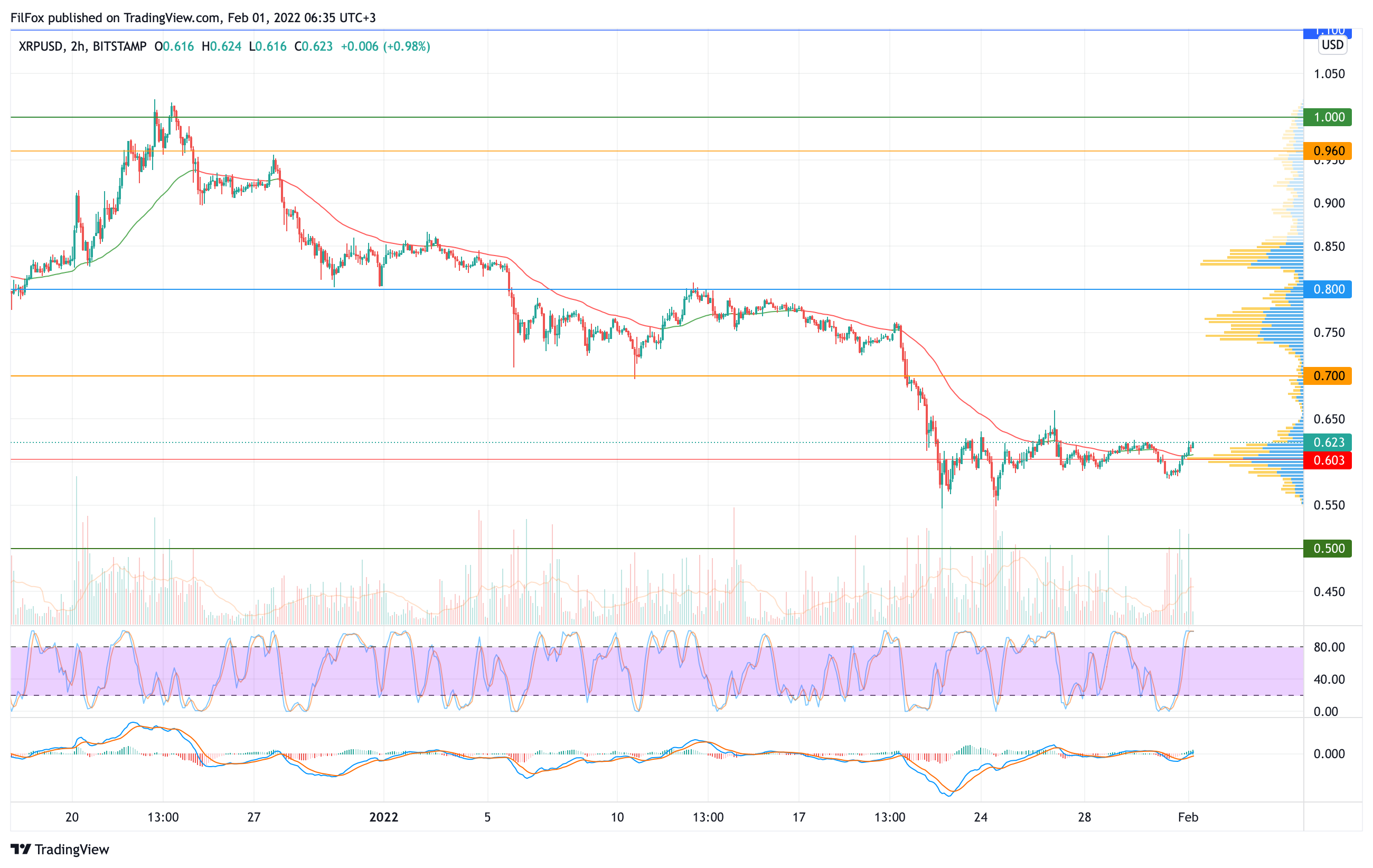Вчера покупатели восстановили цену XRP к индикаторной линии POC (0.603 USD), а вечером смогли закрепиться в области двухчасовой EMA55. До сегодняшнего утра восстановление продолжилось в область 0.630 USD.