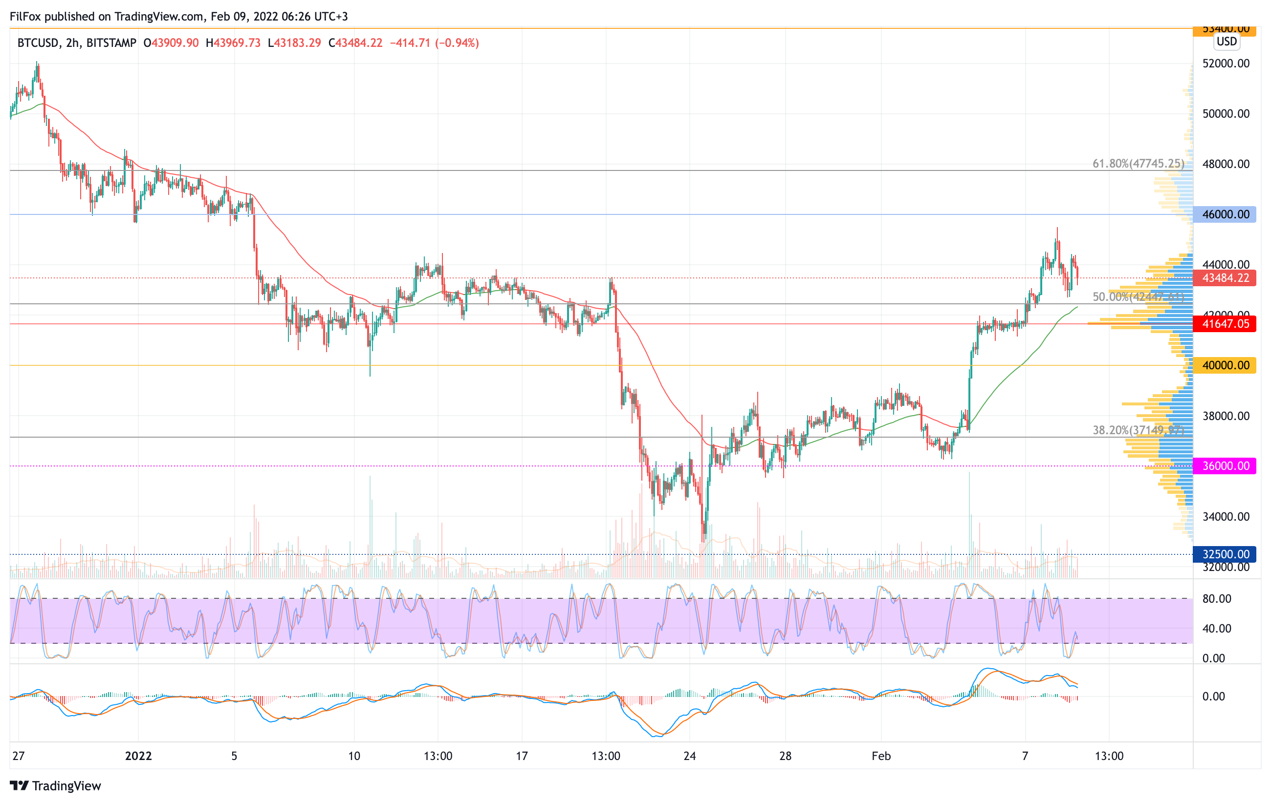 К завершению дня цена биткоина откатилась к уровню 50% фибо (42447.61 USD). Ночью быки пытались исправить ситуацию и восстановить пару, но вернуться в зону дневного максимума не получилось. Сегодня возможен откат к уровню двухчасовой EMA55.