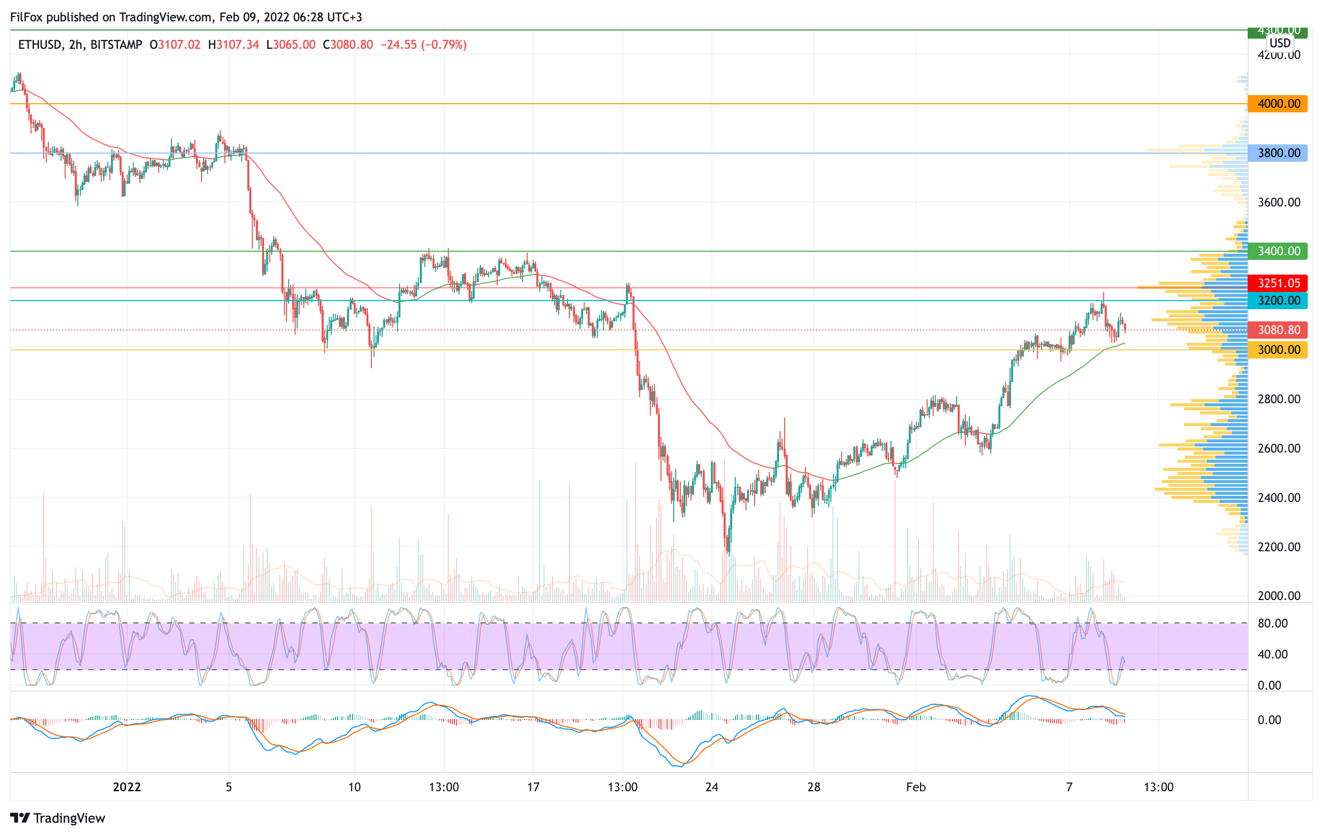 Поддержка двухчасовой EMA55 пока не позволила продавцам протестировать психологическую отметку 3000.00 USD, но сегодня цена Ethereum откатится немного глубже, в район поддержки 2950.00 USD. Полагаем в этой области возможна некоторая консолидация.