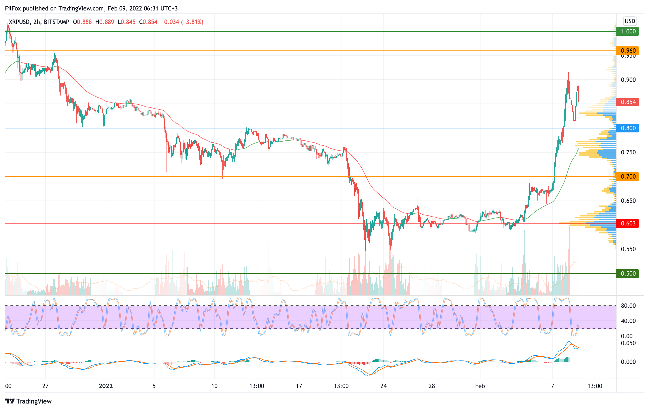 Вчера утром цена XRP протестировала уровень 0.900 USD, обновив максиму в точке 0.915 USD. На этом динамичный рост пары приостановился и цена откатилась к поддержке на уровне 0.800 USD.
