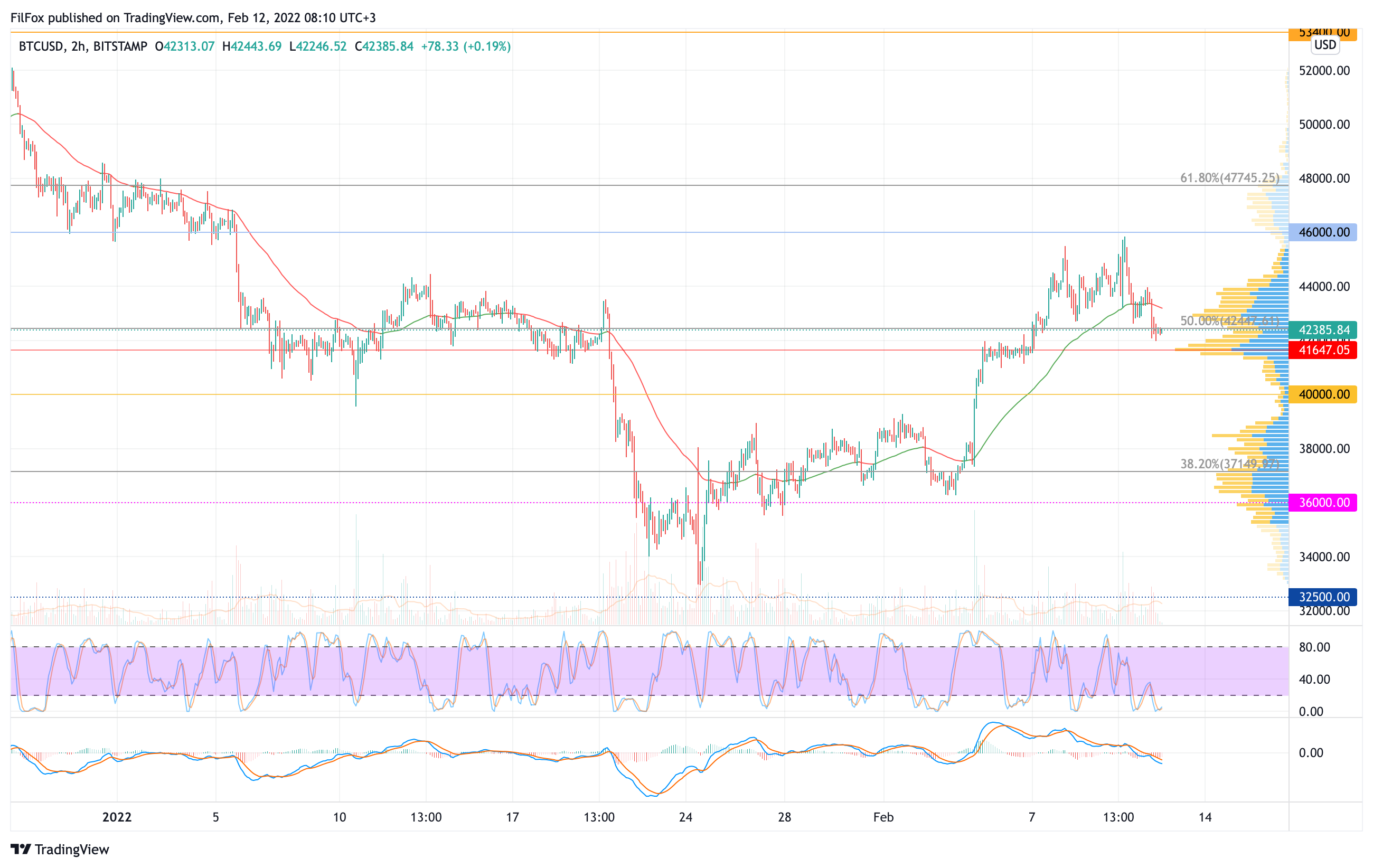 На сегодняшнее утро цена BTC консолидируется в узком боковом диапазоне прямо на пятидесятипроцентном уровне фибоначчи. Если медведи сохранят прессинг, то консолидация сместится к индикаторной линии Point Of Control (41647.05 USD), а до конца недели возможен откат к психологической отметке 40000.00 USD.