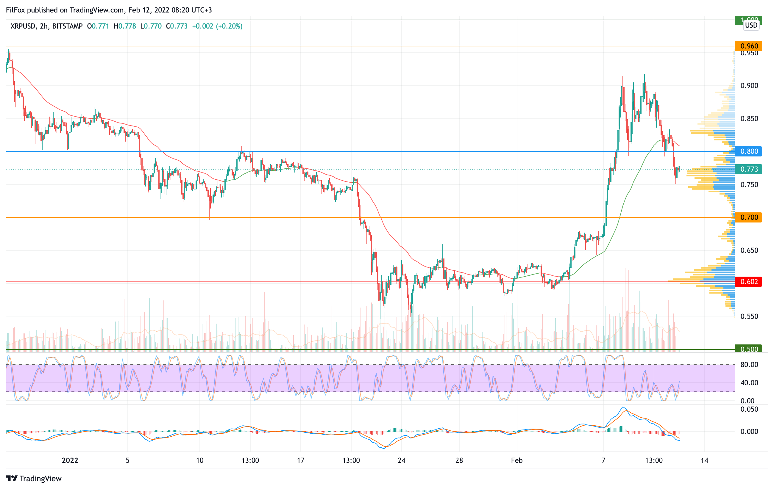 Вчера в первой половине дня поддержка на уровня 0.800 USD ограничила снижение и помогла цене XRP консолидироваться на уровне двухчасовой EMA55. Однако, в завершении дня медведи смогли усилить натиск и прорвать голубую поддержку 0.800 USD, установив локальный минимум в точке 0.751 USD.