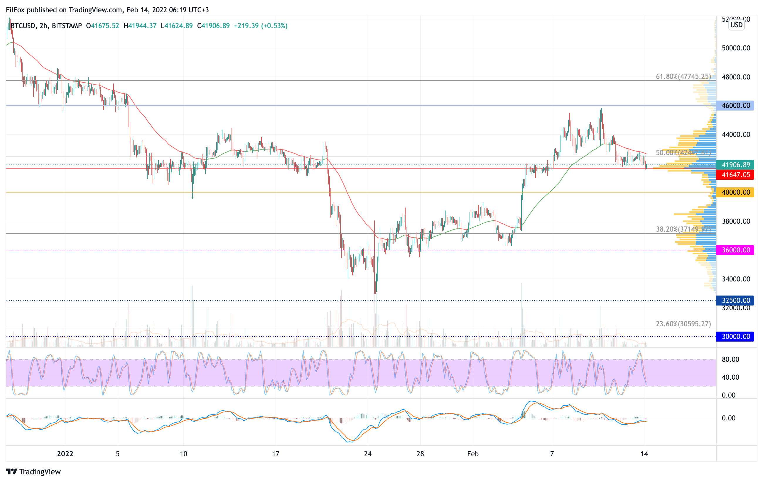 К концу недели пара откатилась ниже 50% фибо (42447.61 USD), а сегодня ночью цена BTC протестировала индикаторную линию Point Of Control (41647.05 USD).
