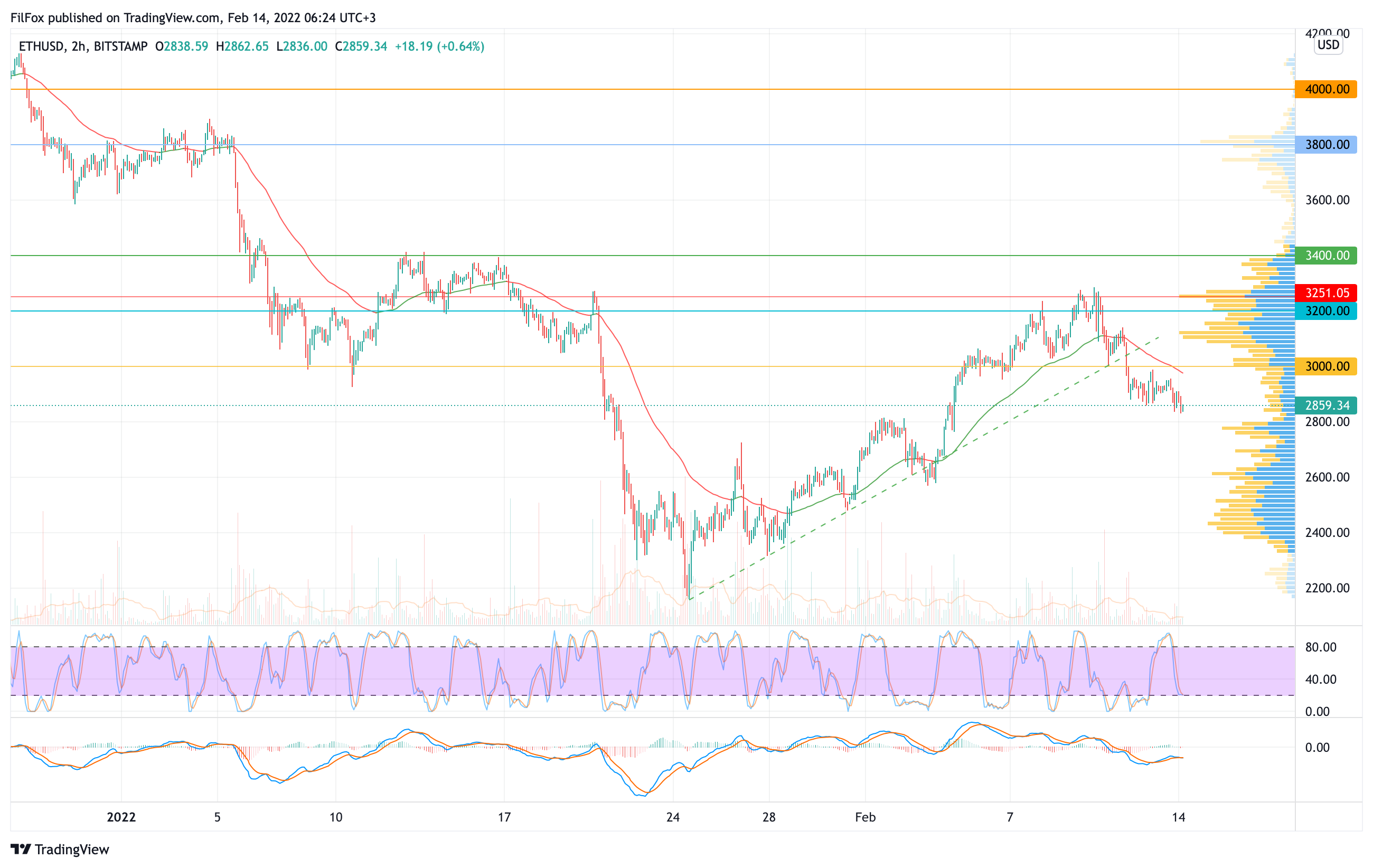 На минувших выходных объёмы торгов были ниже среднего уровня и цена Ethereum не смогла восстановиться в область двухчасовой EMA55.