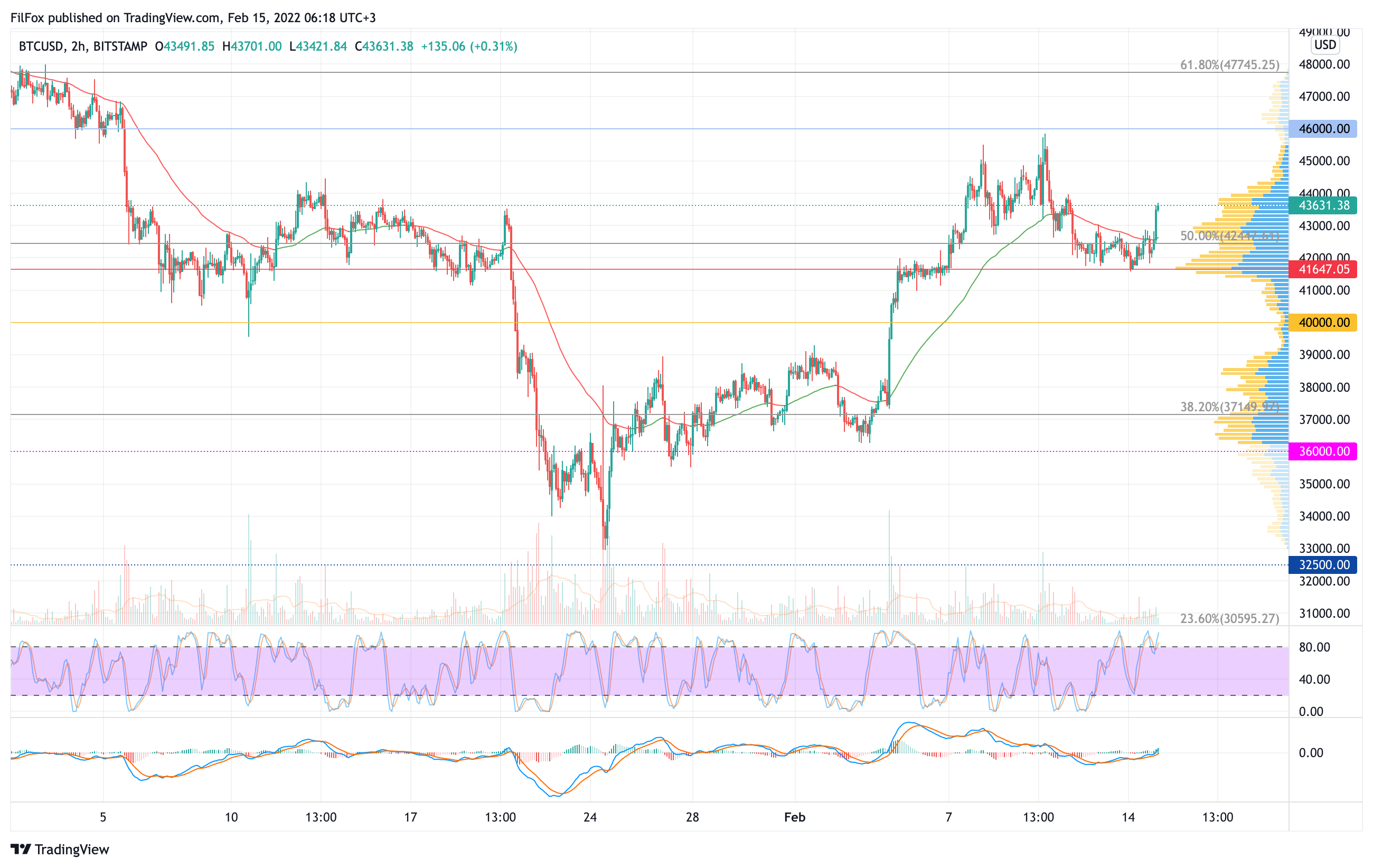 Если покупатели продолжат доминировать, то возможен ре-тест уровня 45000.00 USD. Если в первой половине дня медведи включатся в игру, то цена BTC вернётся к уровню 50% фибо (42447.61 USD).