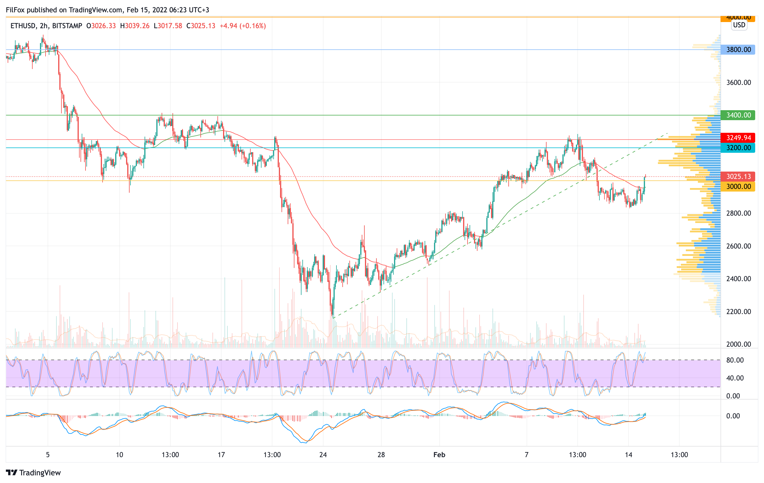 Если продавцы не смогут вернуть пару ниже уровня средних цен, то цена эфира продолжит рост к сопротивлению 3200.00 USD.