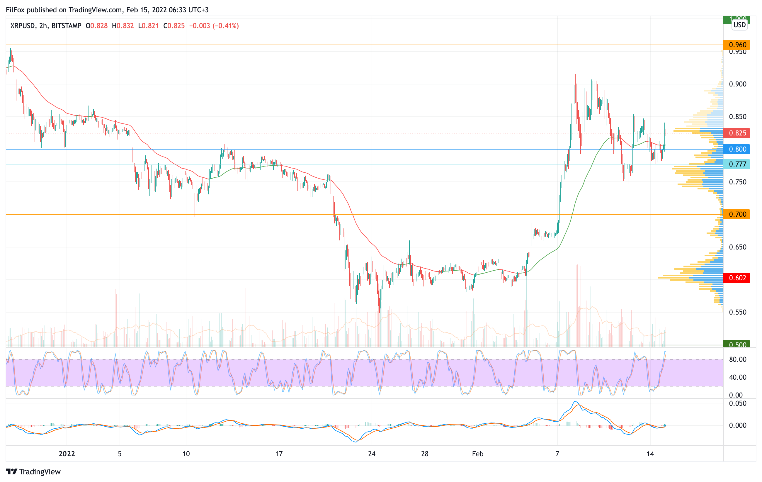 Вчера слабая поддержка на отметке 0.777 USD приостановила снижение цены XRP и покупатели вернули пару выше уровня двухчасовой EMA55.