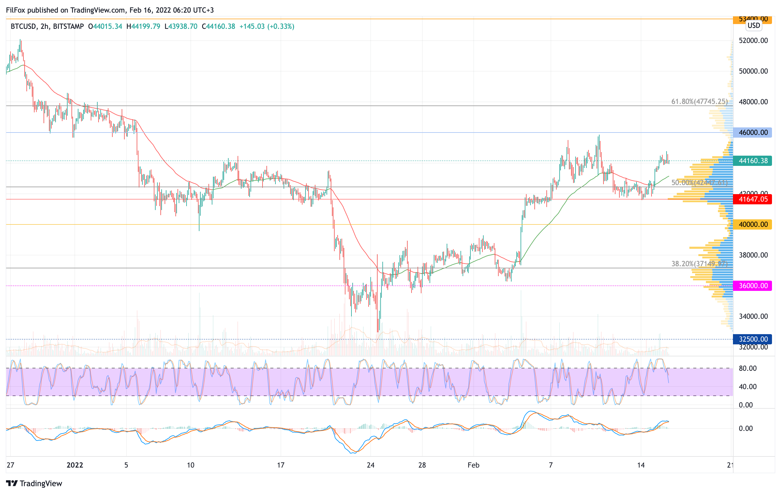 Вчера покупатели смогли продолжить слабый рост и сегодня ночью цена биткоина вплотную подошла к уровню 45000.00 USD. Медведи сдерживают динамику роста, не позволяя паре восстановиться в зону февральского максимума.